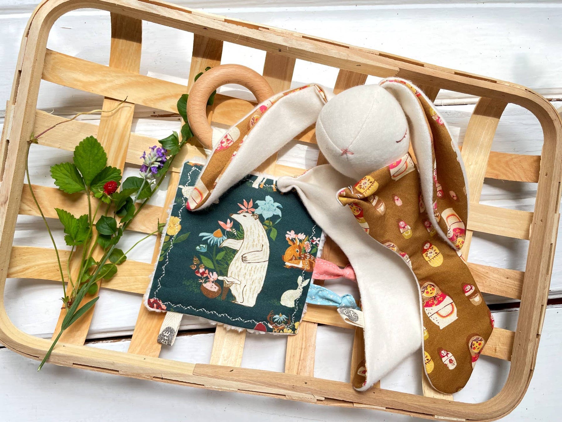 Into the Wild crinkle, tag and teething toy for infants. The two, made-by-hand fabric ribbons are knotted for exploration and possibly some chewing. A knit loop secures the USA sourced, hardwood teething ring. The teething ring is easily removed. Between the two layers of fabric is a crinkle material.