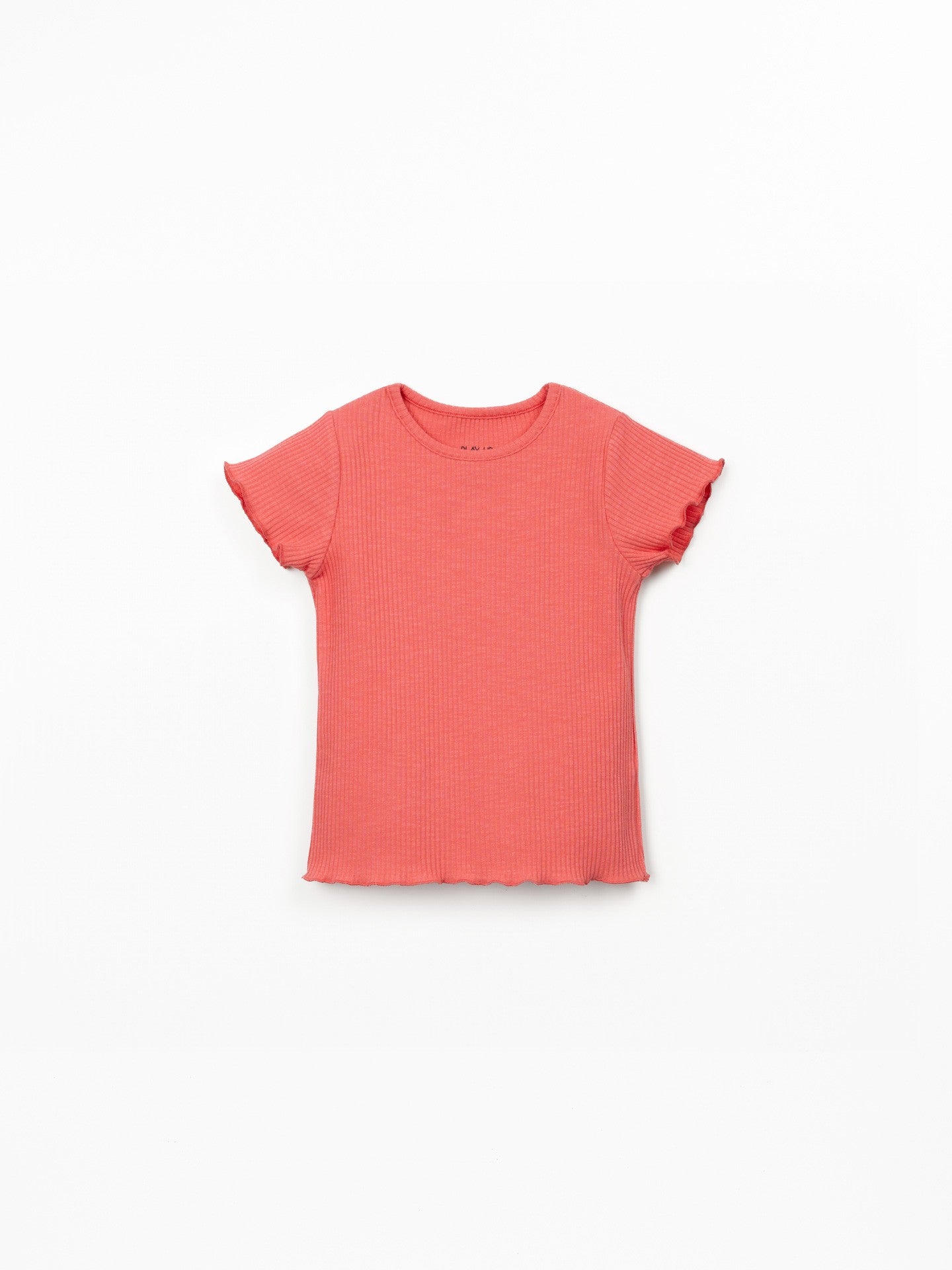 This t-shirt is made of organic cotton jersey, in Coral color. It features a round neckline and short sleeves.