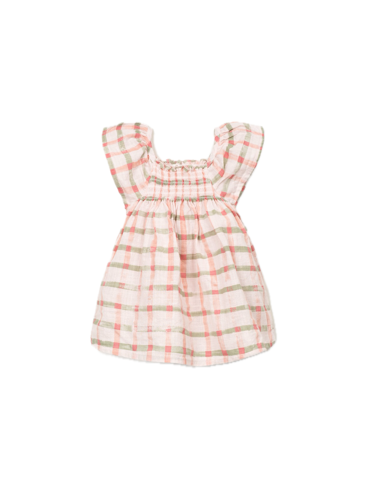 This dress is made of organic cotton fabric, in Light Pink color. It features gathered sleeve inserts, a straight neckline, elastic at the chest, and our check print.