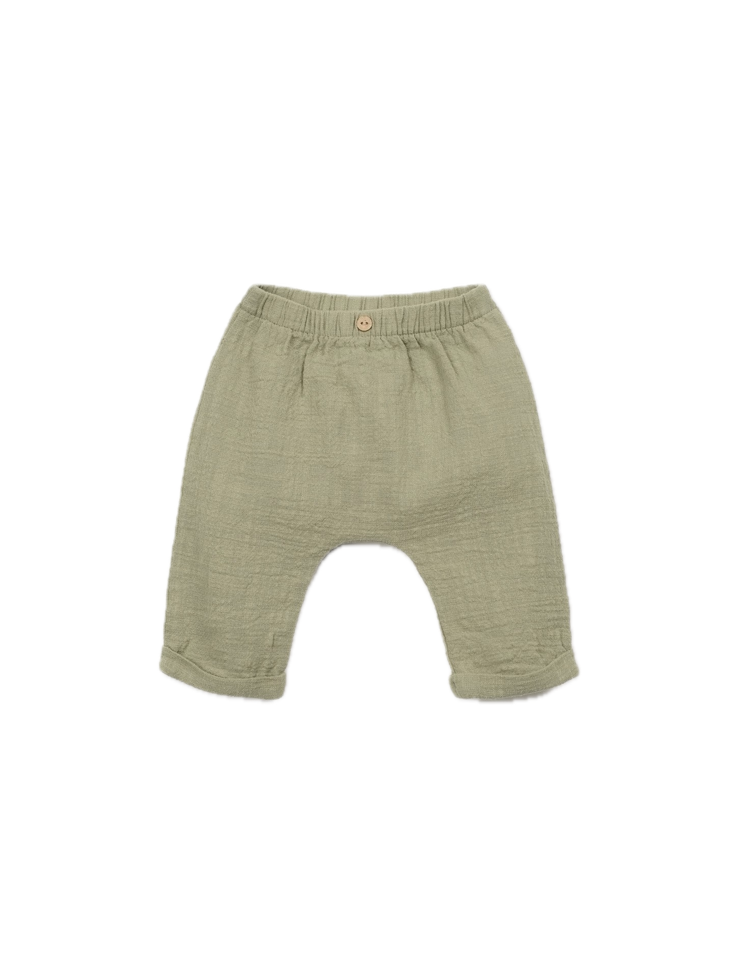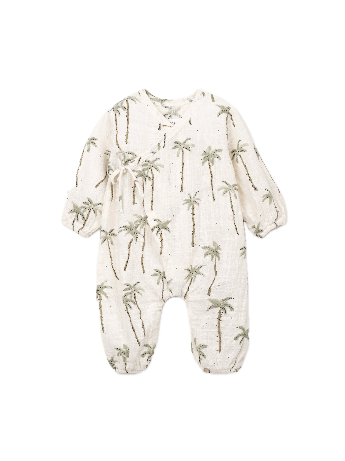 This jumpsuit is made from organic cotton fabric in the color Raw. It has long sleeves, a front wrap opening with an outer tie and a nickel-free metal snap on the inside, and an opening between the legs with nickel-free metal snaps and our palm tree print.