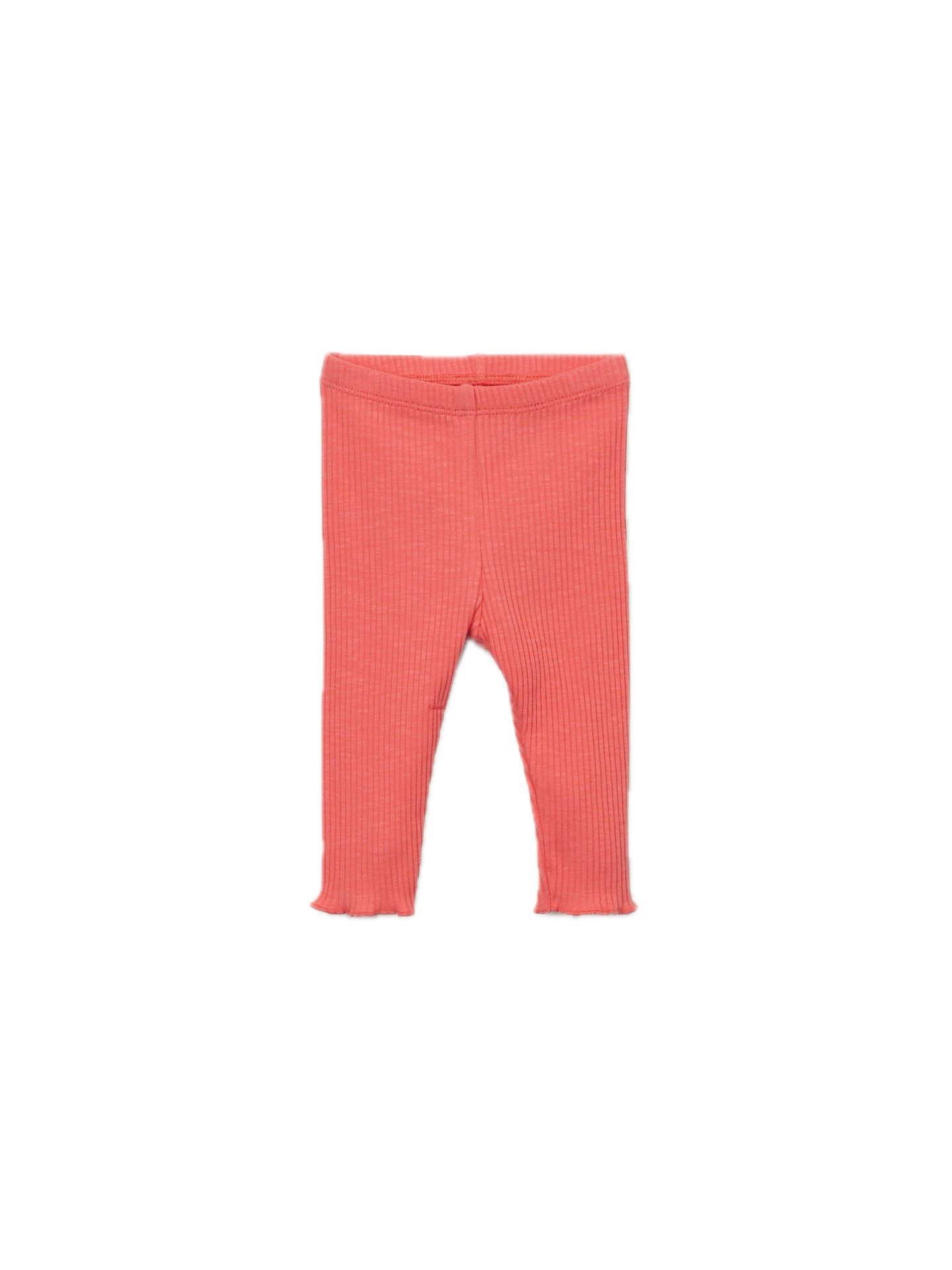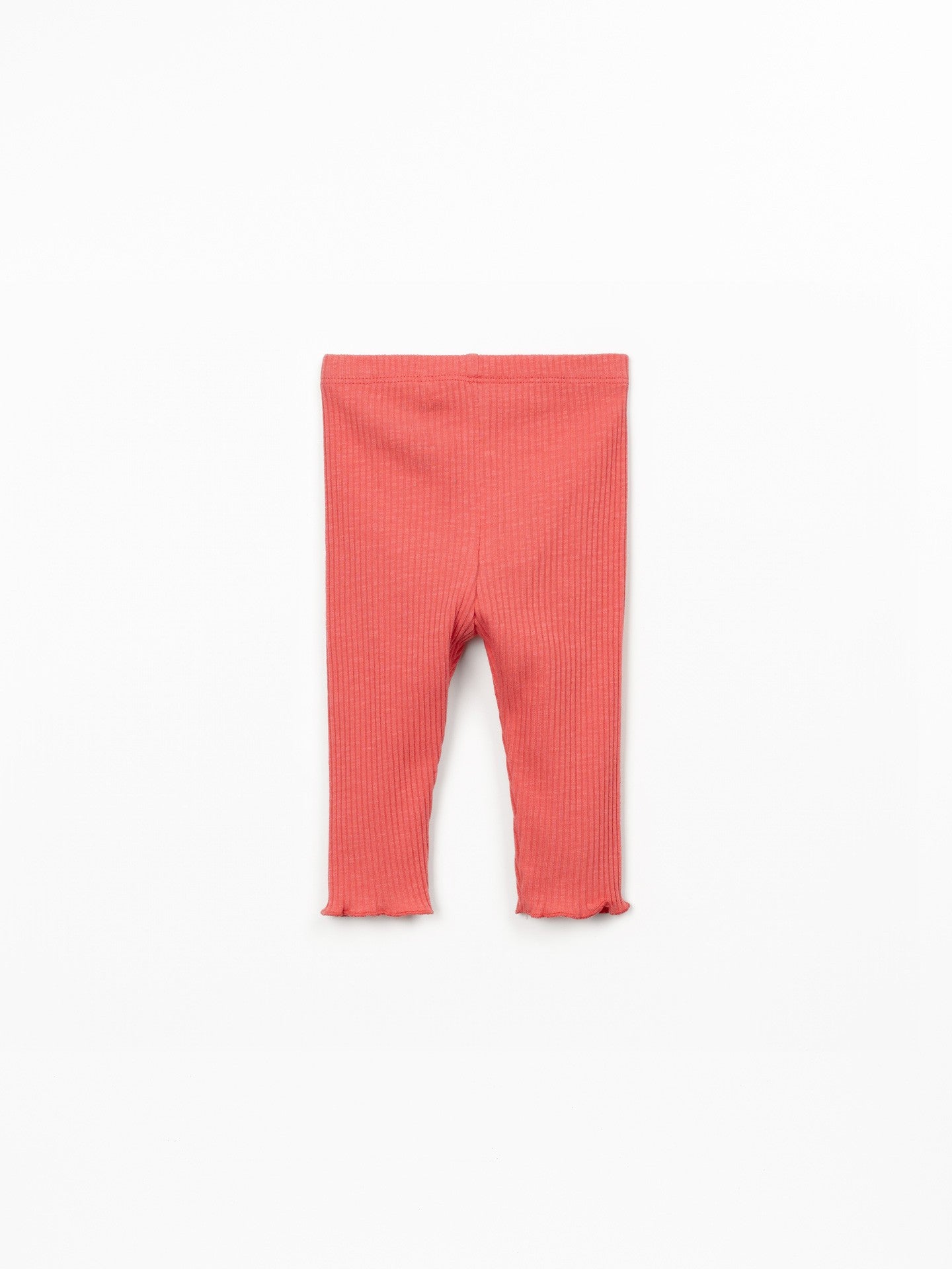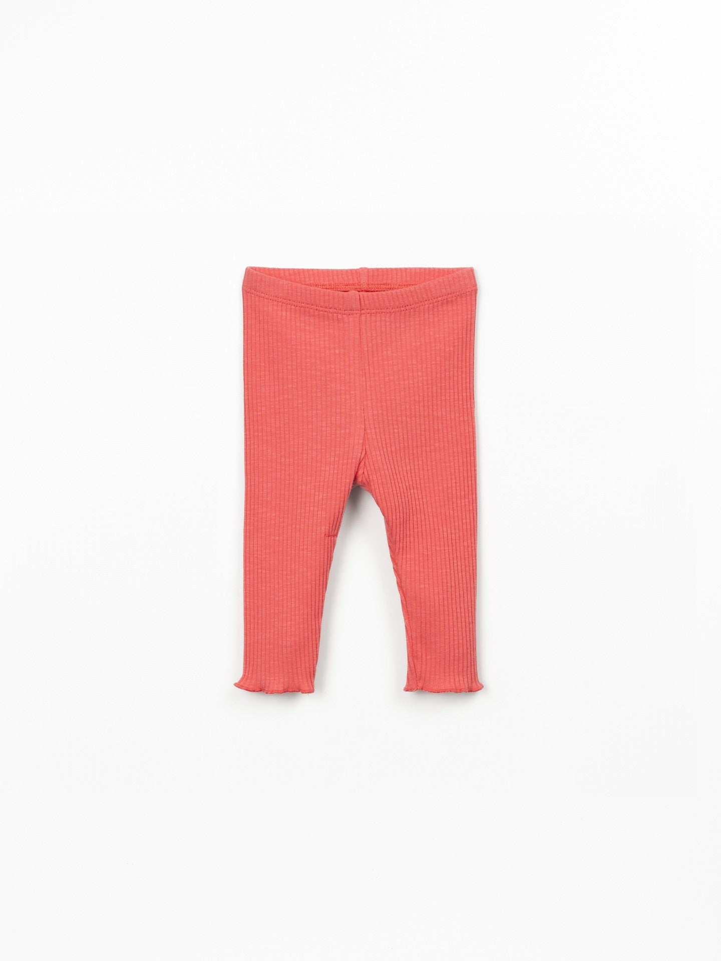 These leggings are made from jersey in organic cotton, in Coral color. They feature a ribbed design and an elastic waistband. The garment is designed to grow with the child, so it can be worn for longer. Unfold the cuff to extend the length of the leggings!