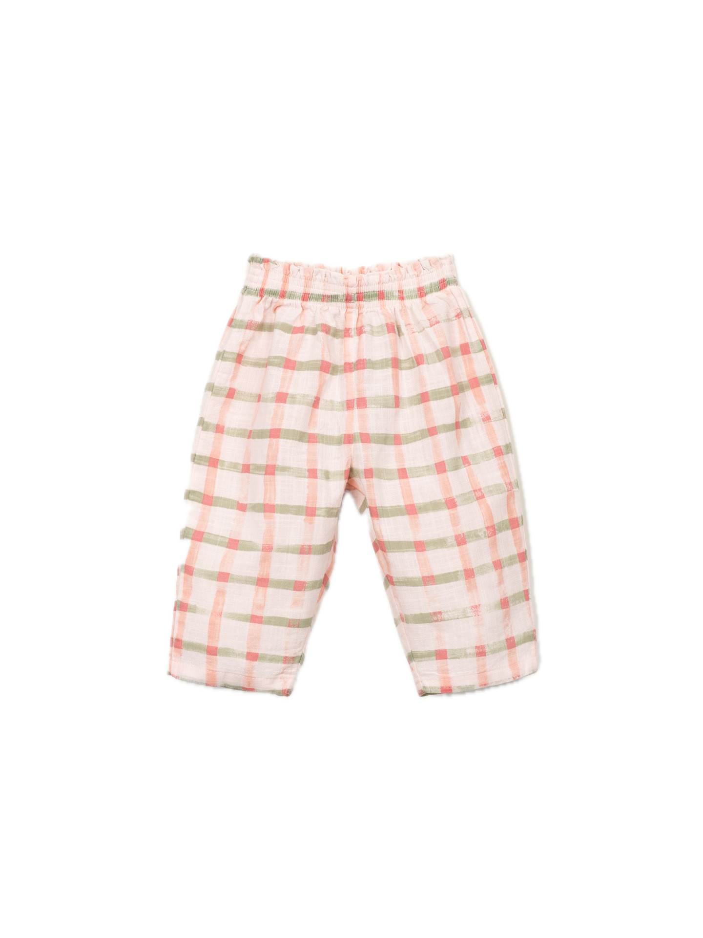 These trousers are made of organic cotton fabric in Light Pink color. They feature an elastic waistband, wide legs, and our plaid print. This piece was designed for transformation and growth, allowing it to be worn longer by the same child. Cut along the slightly darker horizontal line to turn them into a pair of shorts.
