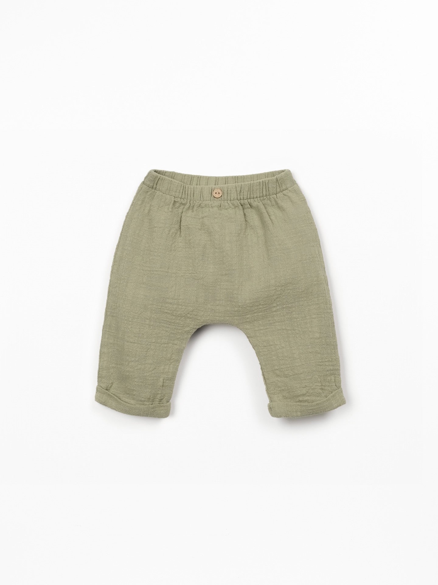 These trousers are made of organic cotton fabric, in Khaki Green color. The model features an elastic waistband and a decorative coconut button.