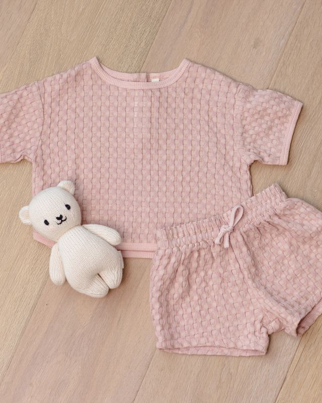 This chunky waffle short sleeve tee and short set is a cool and easy look for warm weather days. Featuring back neck snaps for easy changing.