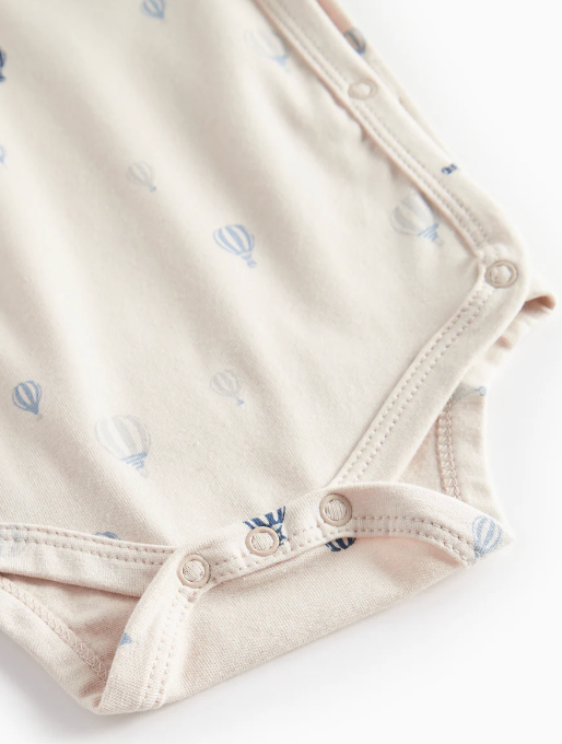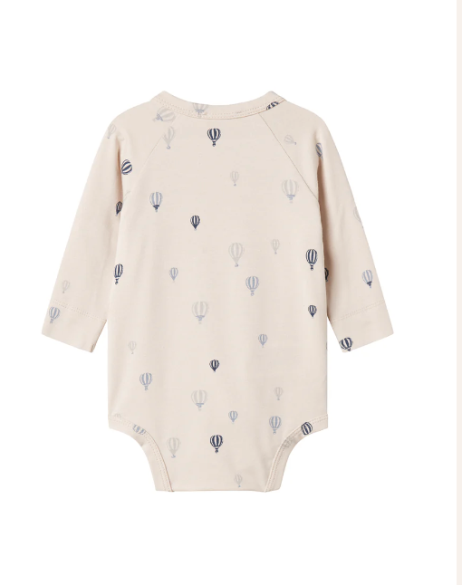 Long-sleeved bodystocking for newborns with a wrap-around closure. The bodystocking closes with snaps, has a nice print and is both soft, stretchy and comfortable to wear.