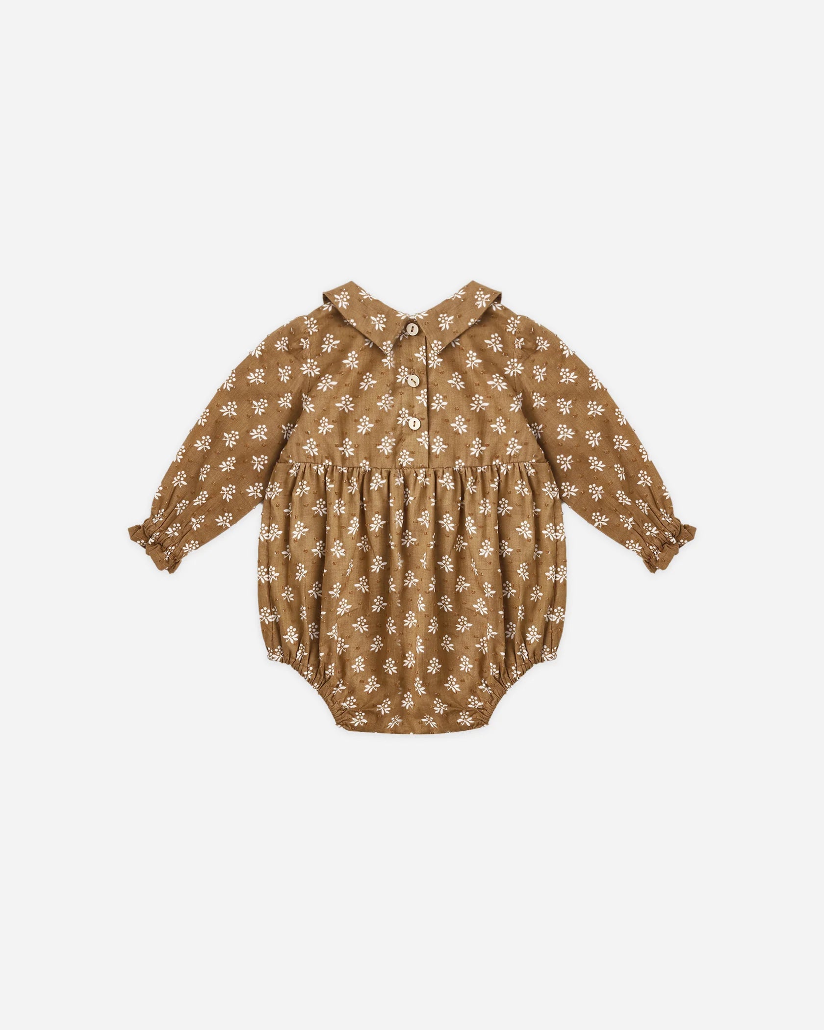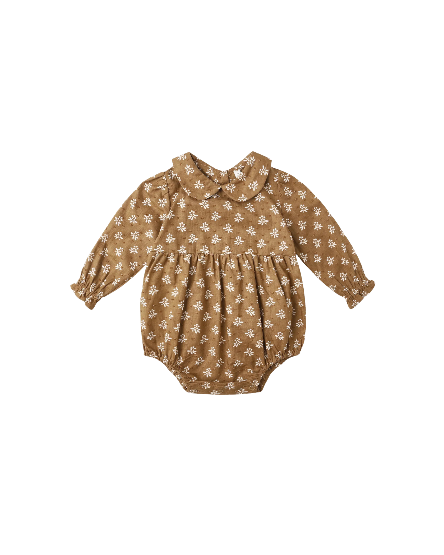 Sweet baby one-piece with a charming Peter Pan collar and long sleeves. Features bottom snaps and a back closure with four coconut buttons for easy changing.