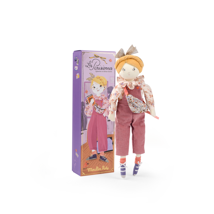 Moulin Roty's Mademoiselle Eglantine is a limited edition doll featuring yellow velour hair in a crown braid, a sweet expression, and a fashionable outfit.. Designed by Lucille Michieli, she comes in a special gift box and is designed to be a companion for children, with a recommended age of 12 months and older.