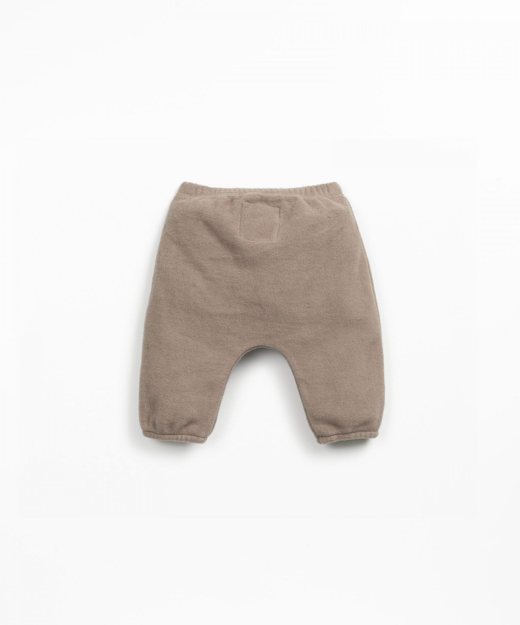 These fleece trousers are made from organic cotton, in Light Brown color. This model features an elastic waistband and a decorative coconut button, with elastic applied at the cuffs.