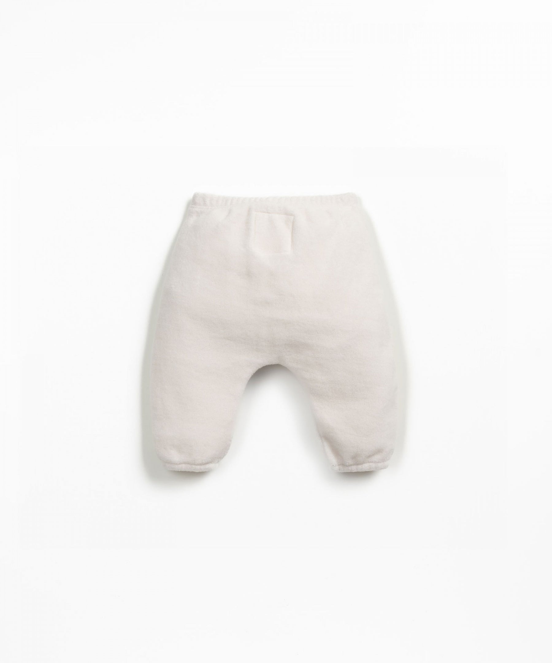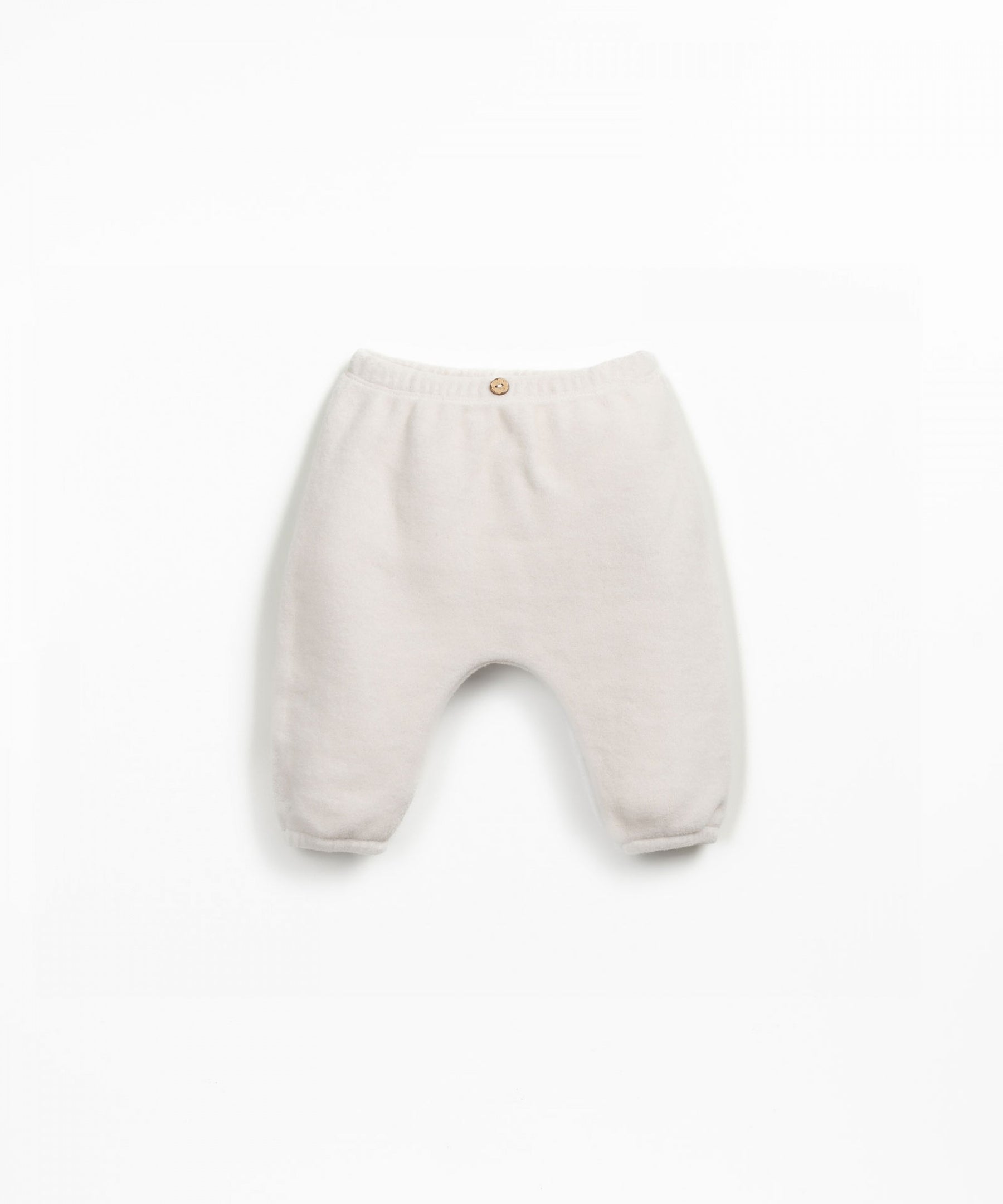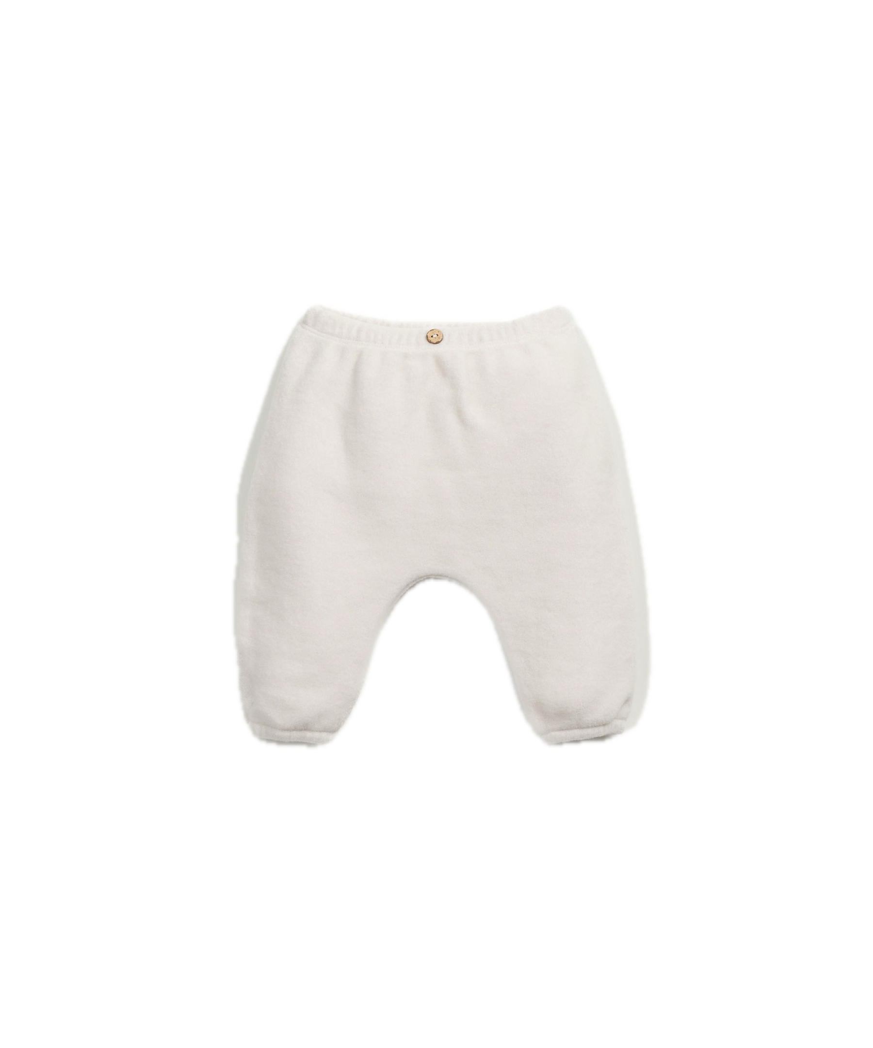 These fleece trousers are made from organic cotton, in the color Off White. They feature an elastic waistband with a decorative coconut button and have elastic at the cuffs.