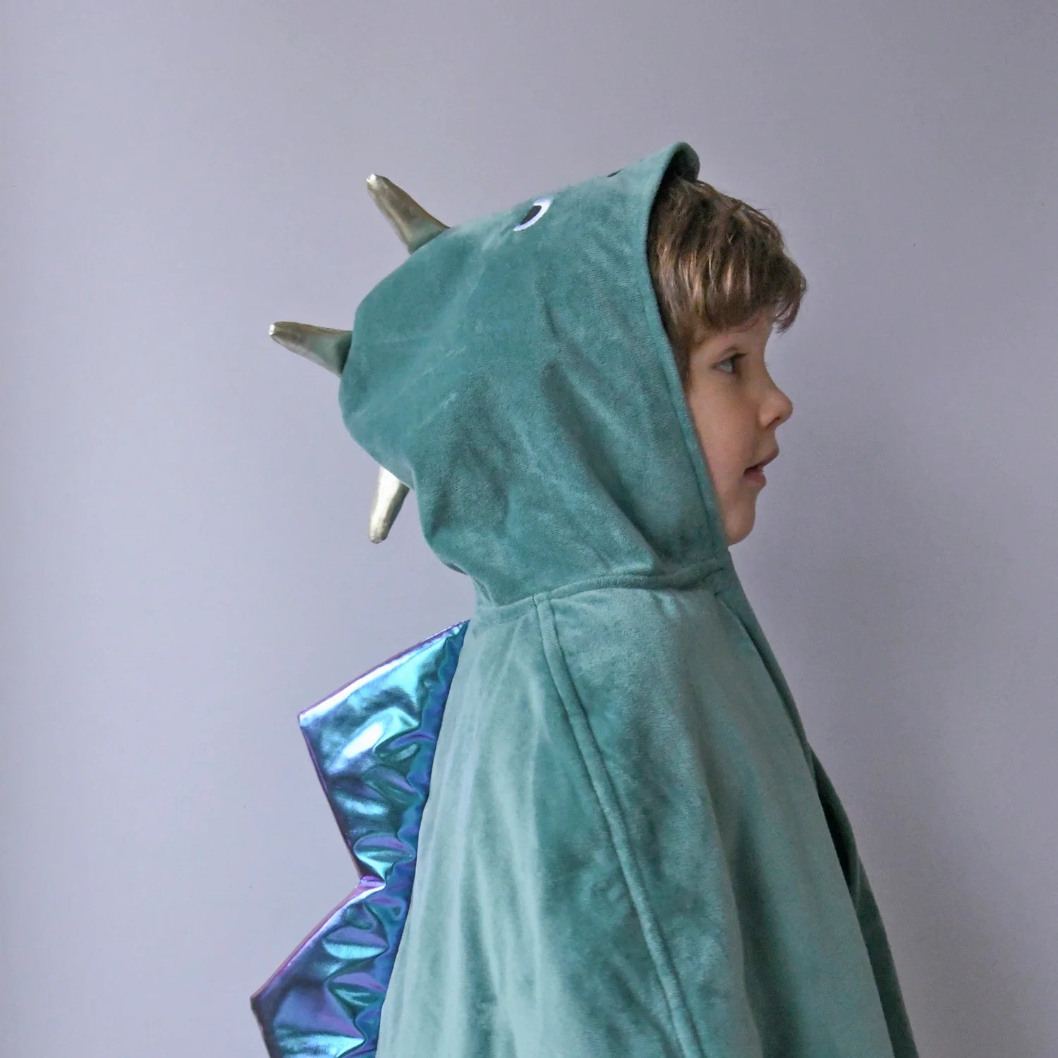 Let your imagination roarrrr with our fun Dinosaur Velvet Cape! Made in super soft velvet and adorned with gorgeous embroidery and iridescent spikes. Each cape has a detailed hood and is fully lined for added comfort! The perfect addition to imaginative play, or a fun addition to the dressing up box. Totally roar-some!