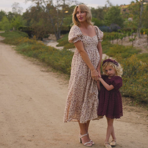 Our Chloe dress features puff sleeves with elastic openings and a ruffle detail, a full single tiered skirt, smocking at the back bodice, and a cinched bodice for a flattering cut.