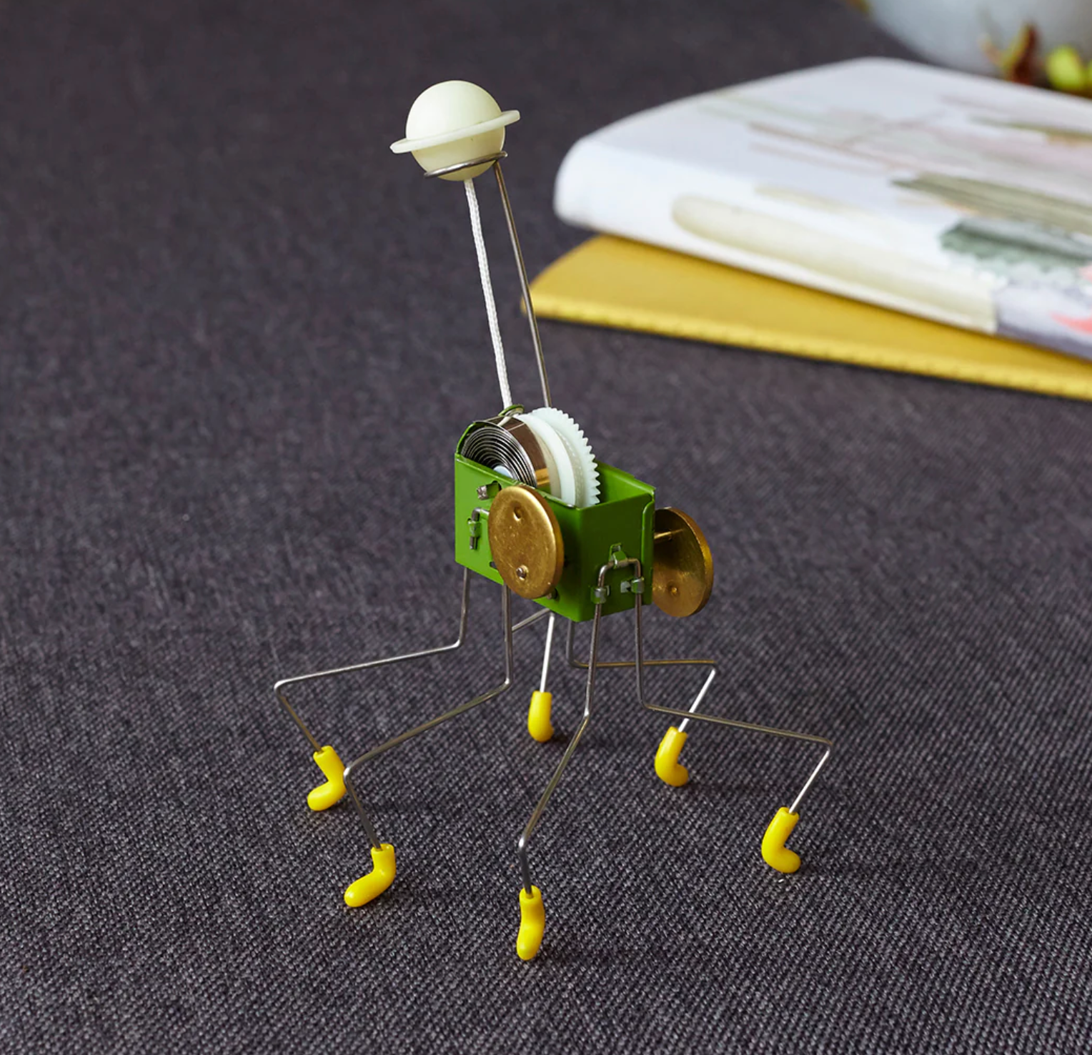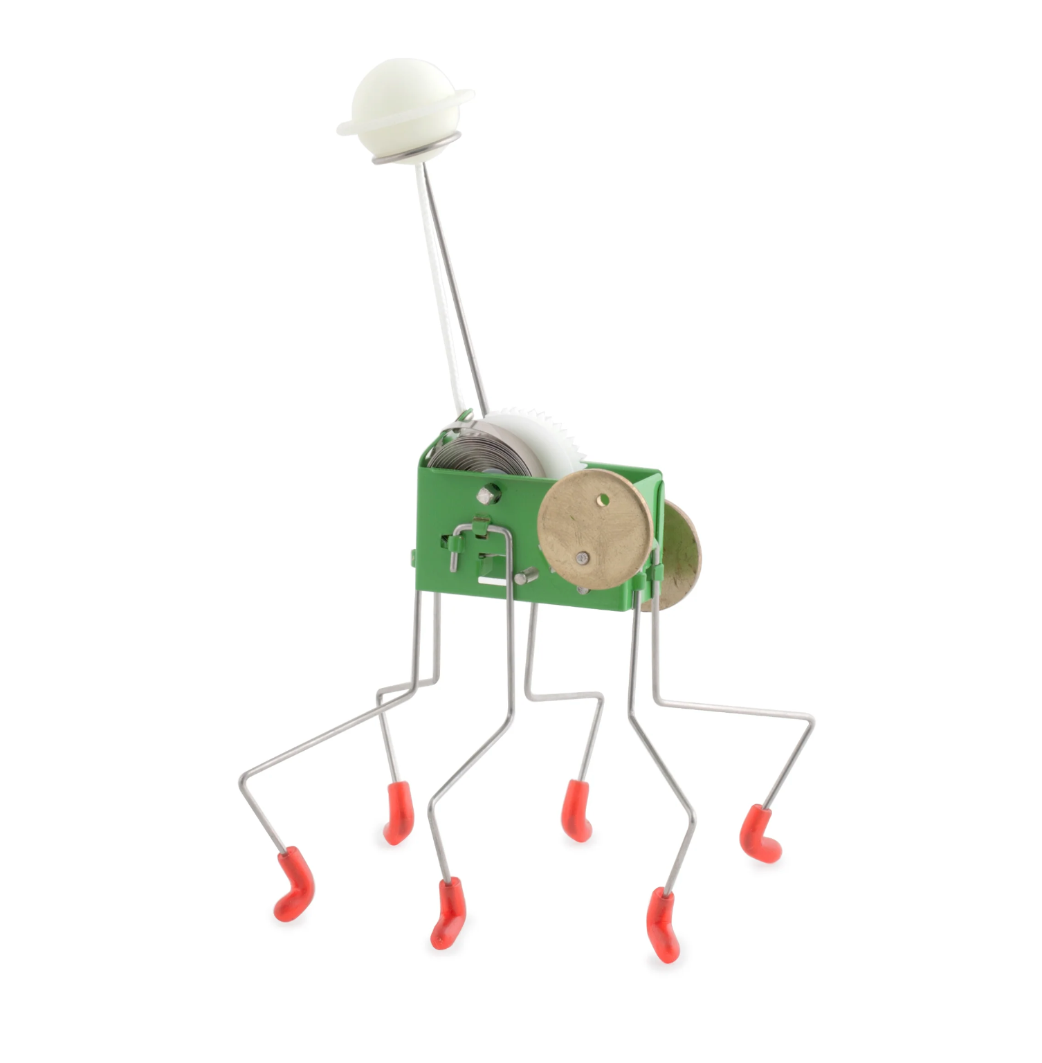 Like the Mars Rover, this six limbed mechanical creature is eager for terrestrial exploration. The nickel plated body is the first member of Kikkerland’s wind-up family that has double spinning off-center weights and a pull string. There are two ways to set this eager little machine into exploration mode; when you pull the “Saturn” planet knob on top while holding the pull string, you can guide this little rover on its path, or you can let it go and watch it forge its own destiny.