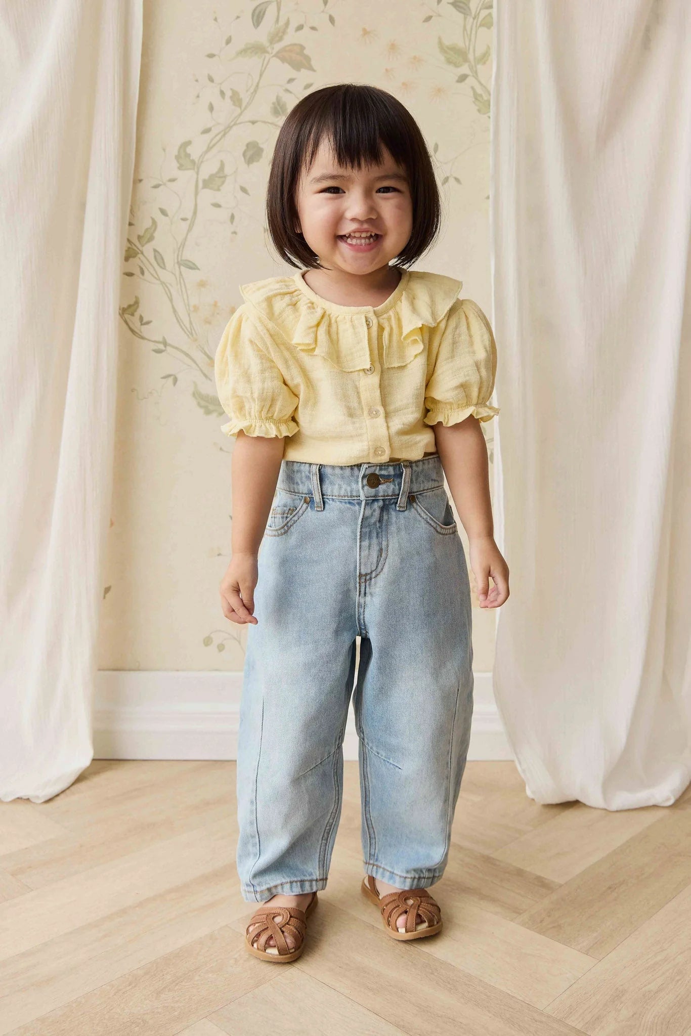 The high-waisted silhouette and soft cotton fabric provide ease of movement while keeping your child cozy. Finished with nickel-free metal accessories and a gentle antique blue wash, the Sierra Pant is a versatile piece that pairs beautifully with any Jamie Kay top.