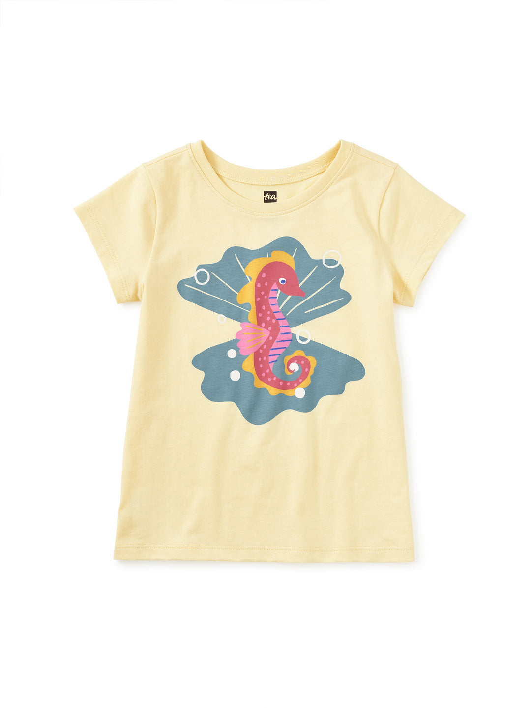 This under-the-sea scene stars a vibrant seahorse framed by a shimmering shell and surrounded by playful pearls and bubbles. With its bright colors and storybook charm, this tee brings a touch of ocean magic to everyday adventures. Crafted from 100% soft cotton jersey, this short-sleeve tee will retain its color and styling after every wear and wash. Pair with pom-pom shorts, a skort, or bike shorts. Above thigh length.
