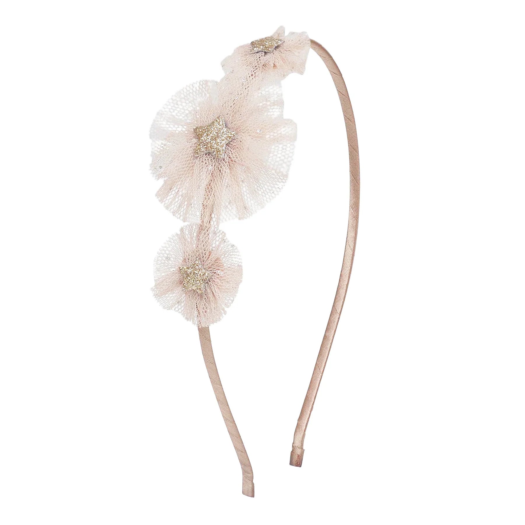 Ribbon wrapped alice band adorned with rosettes made from layers of soft, glitter-speckled tulle, each finished with a sparkling gold star at the centre