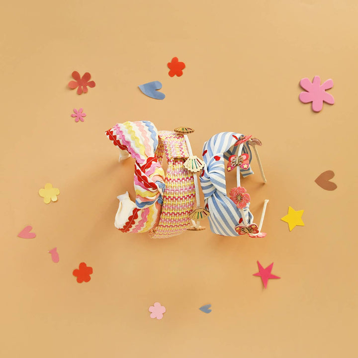 Brighten your day with our raffia striped headband. Featuring a twisted knot and made in a beautifully bold woven fabric, this headband is made for a comfortable fit for little heads! Matching hair clips also available. Not suitable for children under 36 months due to small parts. Style code: H2373M