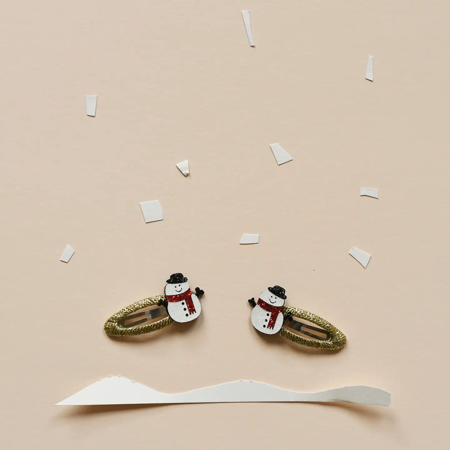 Our jolly snowman is made from a soft white glitter, and has a glittery scarf and top hat! Sat upon gold ribbon wrapped snap clips, these make the perfect snowy day accessory. Made using recycled glitter and felt. Not suitable for children under 36 months due to small parts.