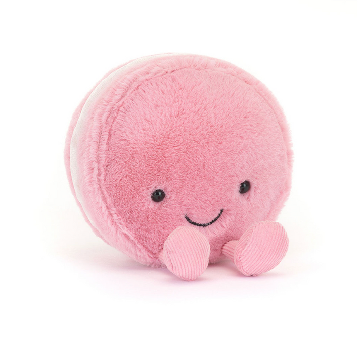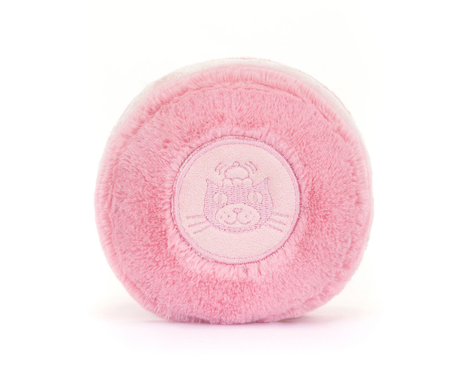 Amuseables Mia Macaron is a fruity, friendly treat in soft strawberry fur. With a velvety filling, matching cord feet, and stitched smile, Mia has an embroidered Jellycat logo on the back for a truly luxurious treat!