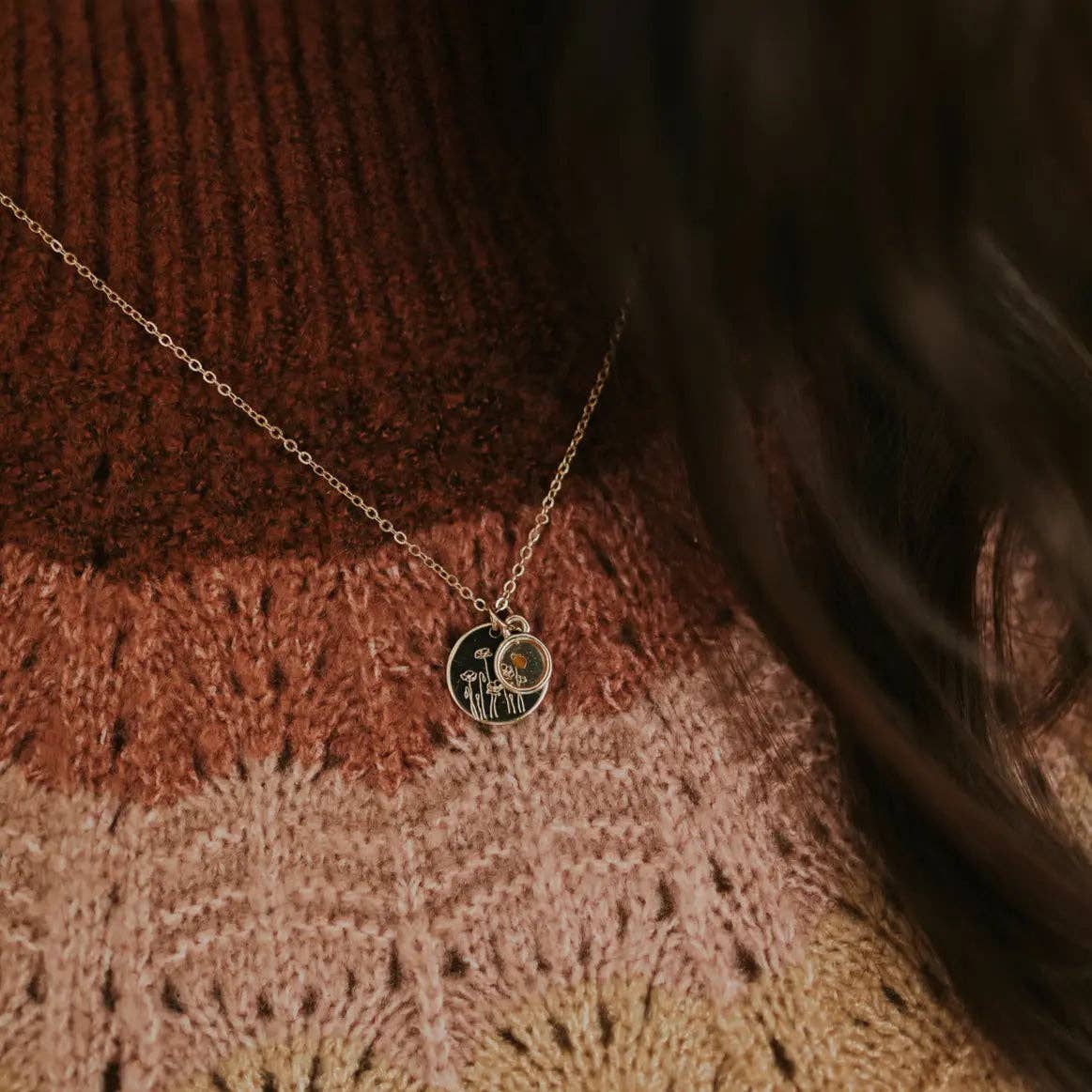 The Poppy Necklace with Mustard Seed is 18k gold plated. The chain is 18 inches and comes with an extender up to 20 inches.