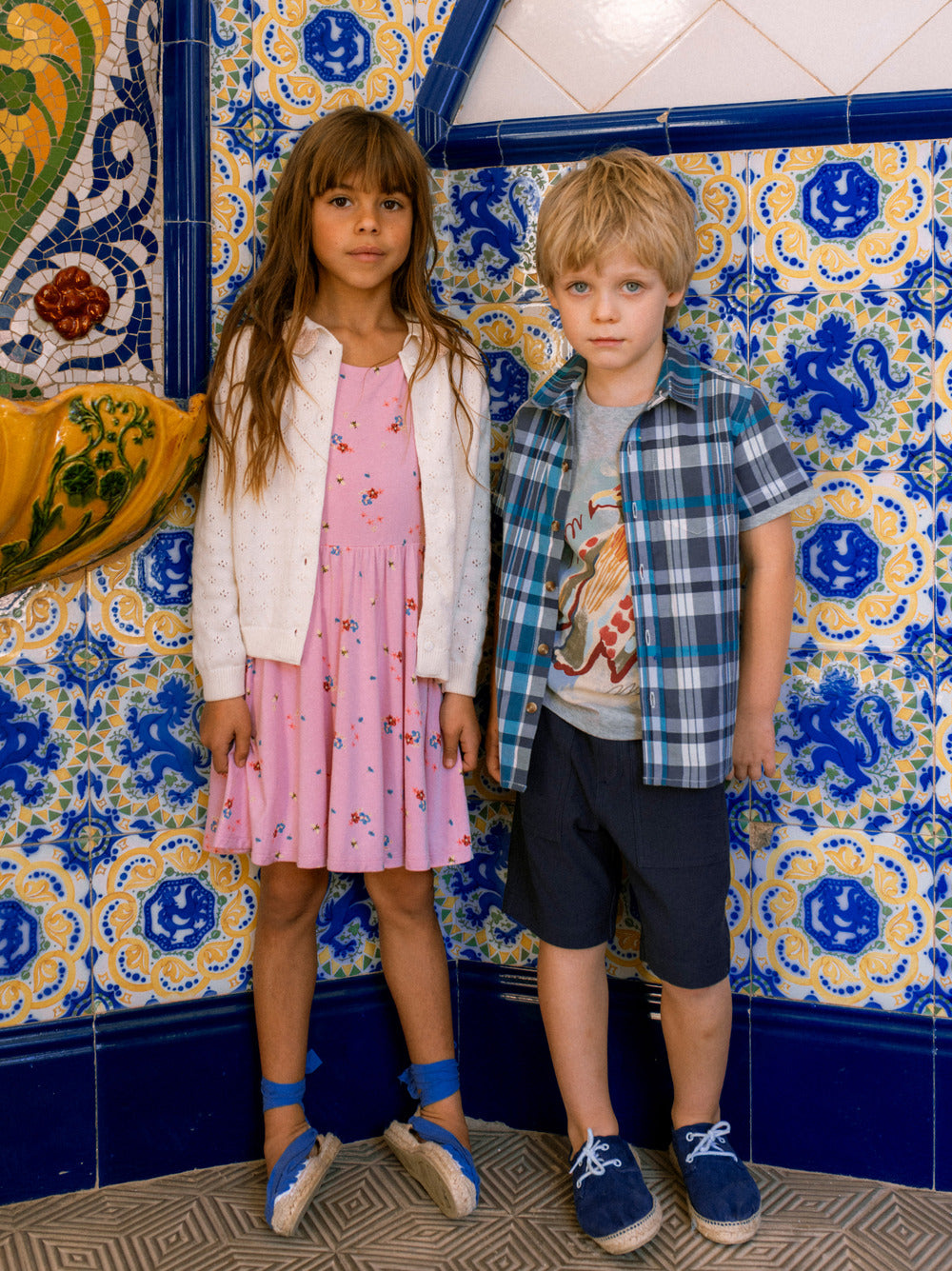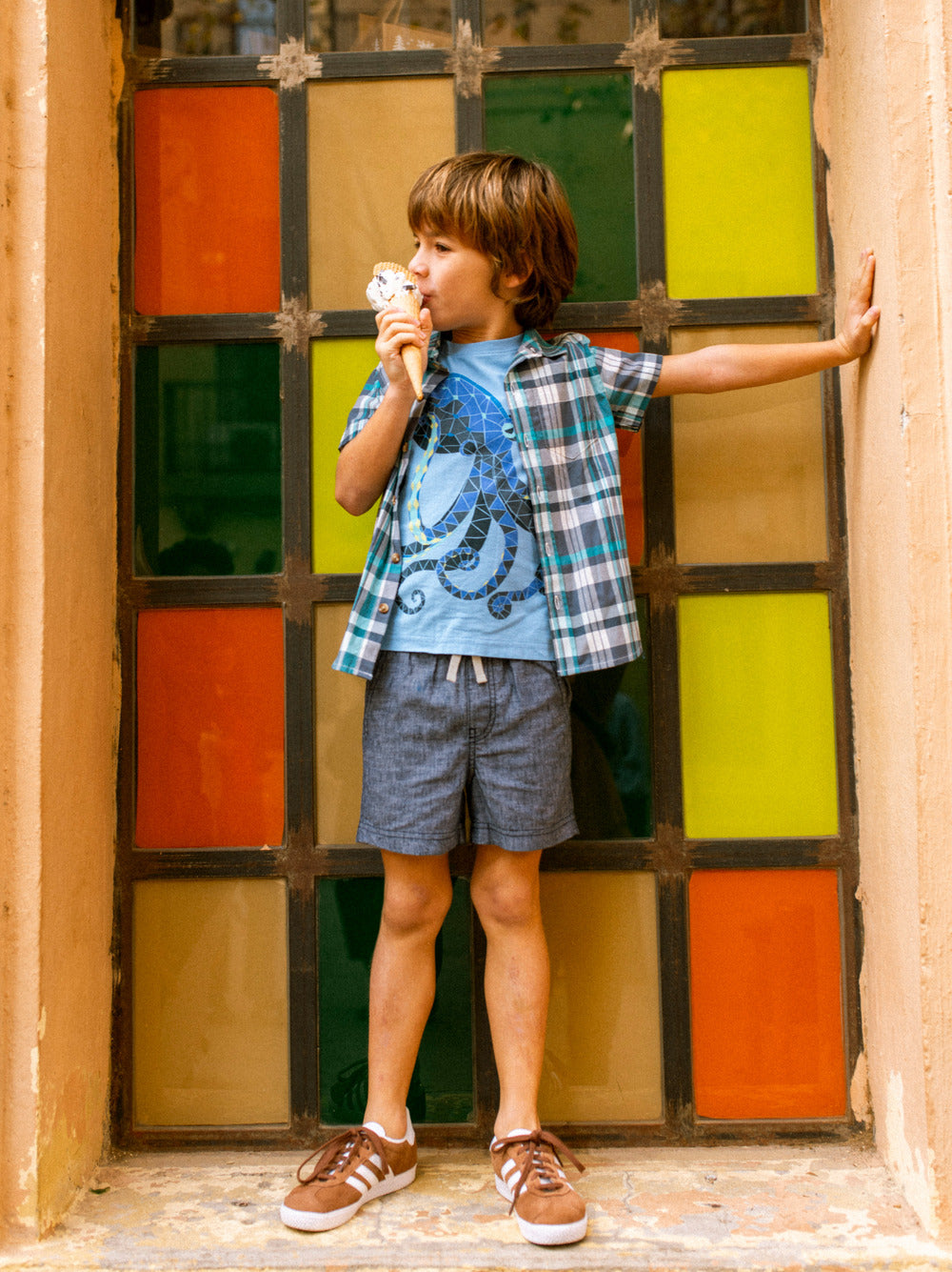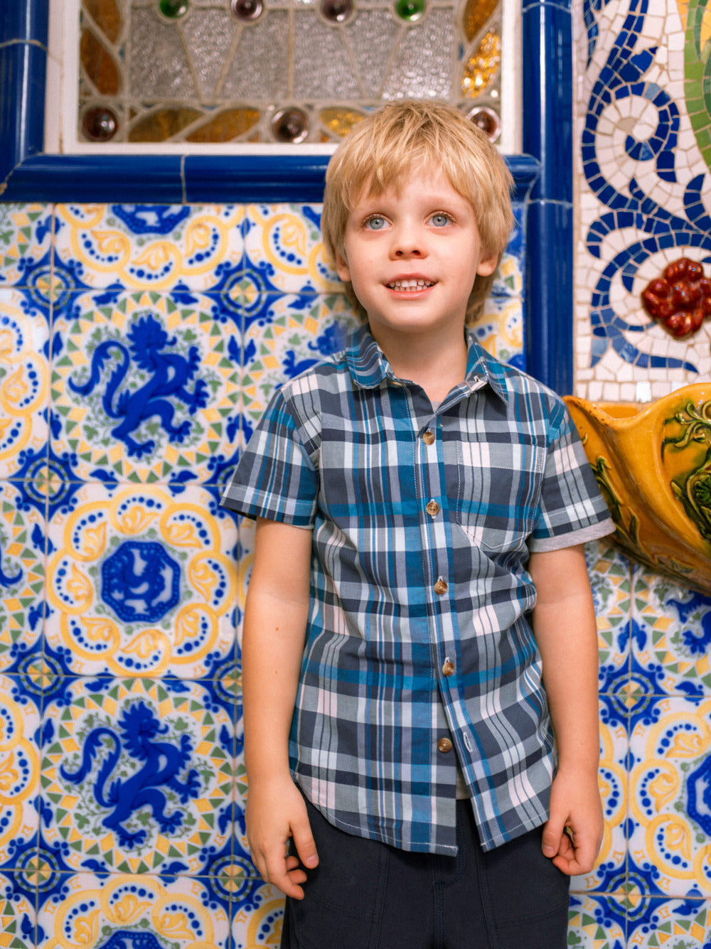 A timeless warm-weather staple, this short-sleeve button-up features classic madras plaid in rich, blue tones. Designed with a clean foldover collar and an easy, standard fit, it strikes the right balance between polished and laid-back--great worn on its own or layered open over a tee. The chest patch pocket adds a casual finishing touch that works for everyday wear or special moments. Pair it with Playwear Shorts for everyday outings, or style it with woven shorts for celebrations and more dressed-up occasions.