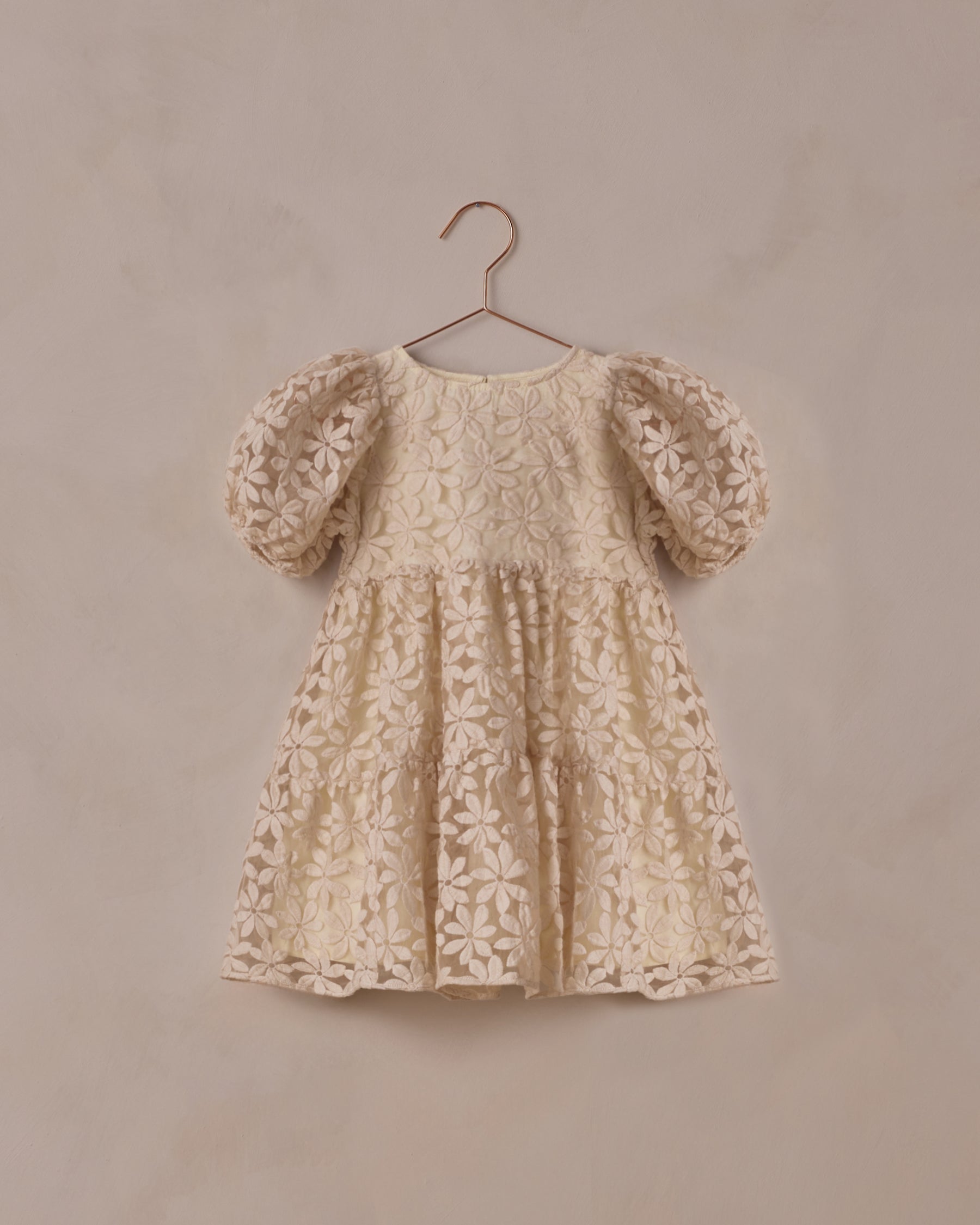 This dreamy, midi-length dress features a layered tiered skirt, full puff sleeves, and a delicate teardrop back closure, perfect for your special occasions. Coordinating bloomers included with size 2Y.