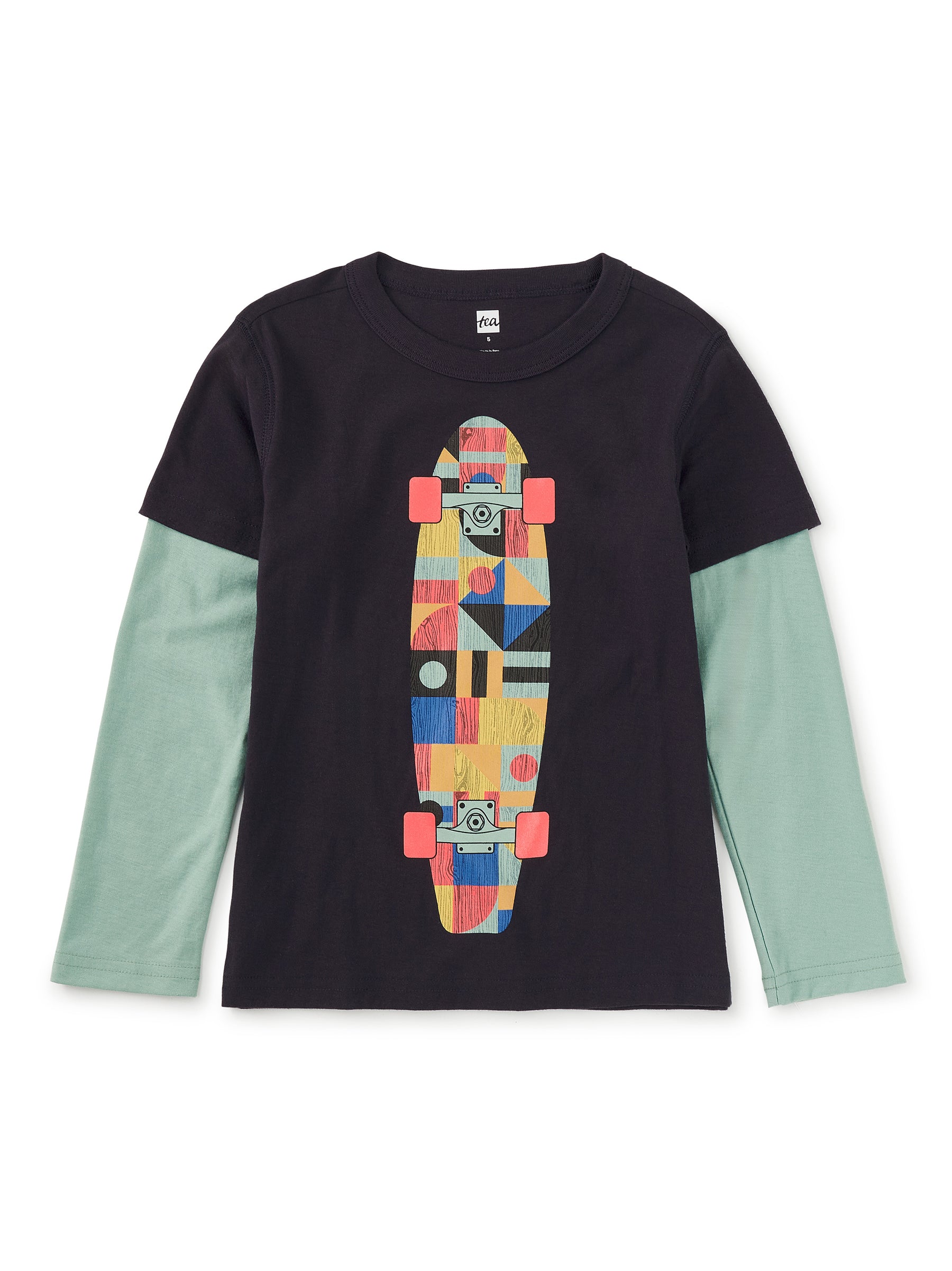 All set to roll--this tee brings major skate park energy with its colorful deck graphic and built-in layered look. Designed to keep up with little thrill-seekers, it's a standout piece whether they're cruising the sidewalk or just spinning through the day. The double-sleeve style gives cool, laid-back vibes without needing an extra layer.