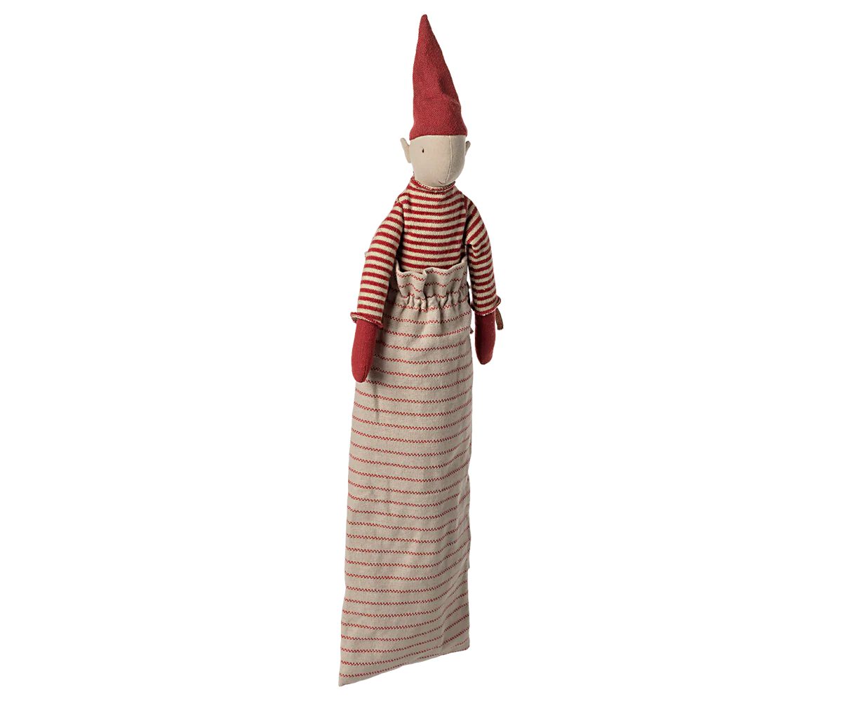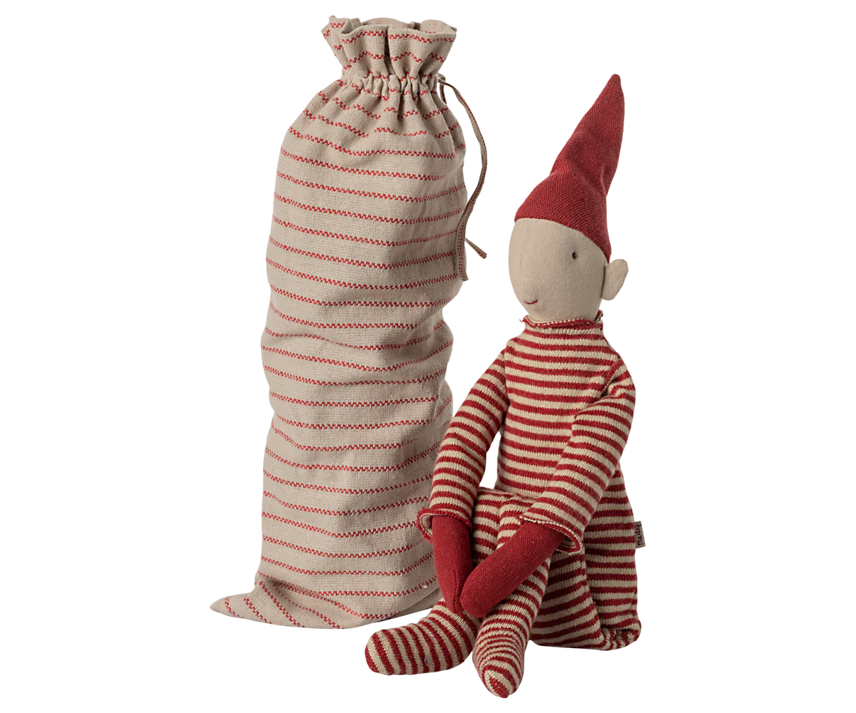 A long legged pixy in a soft knitted suit, it has magnets in hands so it can sit or hang whereever is suitable. It comes in soft fabric bag.