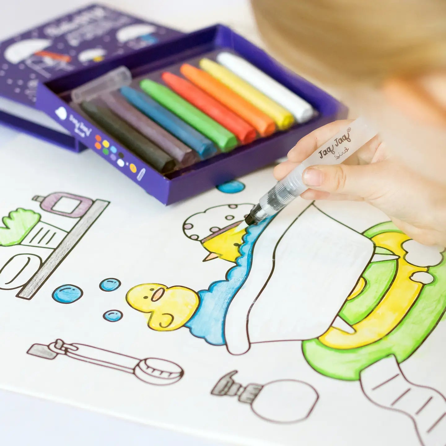 ButterStix® Chalk Aquarelle are hexagon shaped sticks are the perfect shape and size for little hands that are continuously developing fine motor skills. Use it dry and enjoy dust free and mess free coloring fun. Add water using the included Aqua Brush Pen to blend and turn your colored art into watercolor art instantly. A handy color-mixing chart is included at the bottom of the drawer shows you how to make new colors by blending two together. • Richly pigmented and non-toxic • Fun and mess-free • Erasable on non-porous surfaces • Use it dry or wet (with the included brush) • Comes with a sturdy box to store you brush and Aquarelle chalk • Easy wipe off with damp cloth • Ingredients: oil, corn flour, titanium oxide, pigment • Reusable storage box • Non-toxic, conforms to ASTM D-4236 • Ages 3+ Great for stocking stuffers. Please always test the erasability of ButterStix® when applying to any non-Jaq Jaq Bird® surface. Do not leave it on surfaces for an extended period of time.