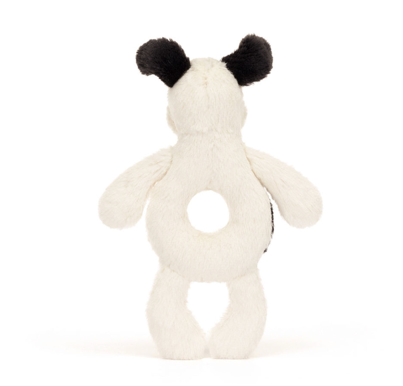 Keep little paws busy with the Bashful Black & Cream Puppy Ring Rattle. With four squashy paws, adorable perky black ears and a gentle rattle which delights at every shake. Crafted in the softest fur made from recycled fibres, our much loved Bashful character pup is both a toy and comforting companion, ready to soothe and entertain at any given moment!