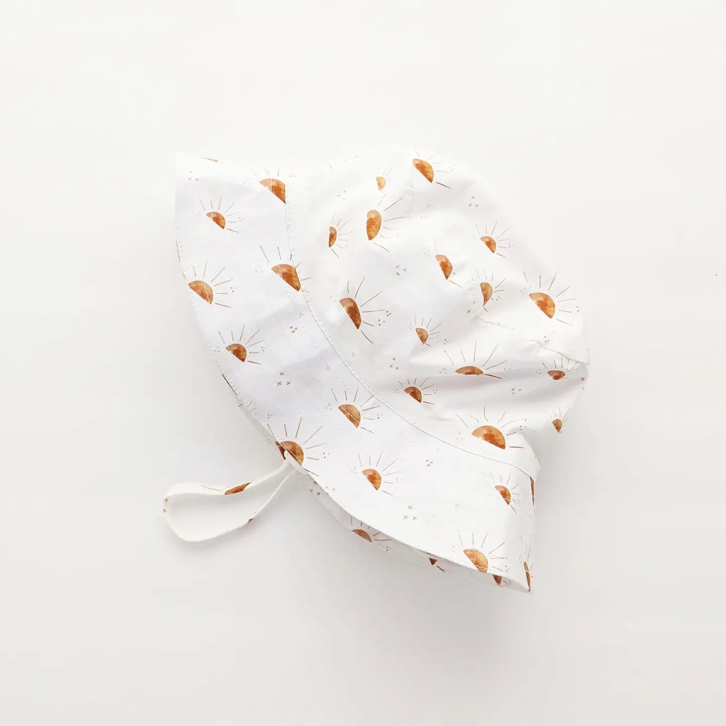 Perfect for the beach and everyday wear, this lightweight UPF 50+ bucket style sun hat is functional and cute. This one has a modern sunshine print in a warm brown on a white ground. The hat has an adjustable chinstrap to keep hat in place, with a breakaway clasp for safety. • 100% Cotton • Cold handwash, Lay flat to dry • Made in China