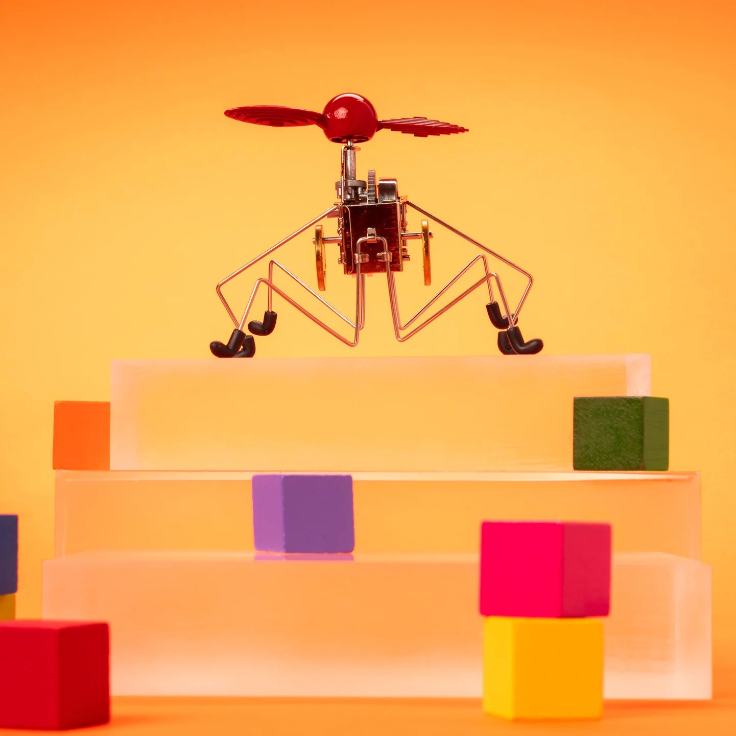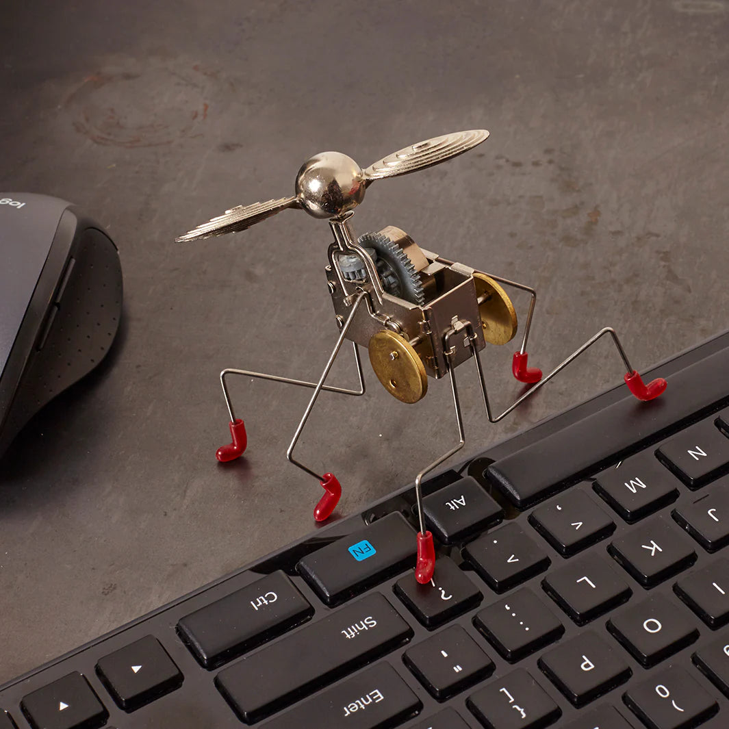 Carlo Maria Pintacuda was a legendary Italian race car driver and the inspiration for this wind-up that bares his name. The plucky and unpredictable spirit of a feisty Italian race car driver is re-imagined with our Pintacuda wind-up. This wind up has legs at different heights, which allows the Pintacuda to hop about and appear to take flight. The propeller key can be wound with just one finger, and you can slightly change Pintacuda’s behavior by bending the wire legs gently near the body or the knees. This is a feisty one.