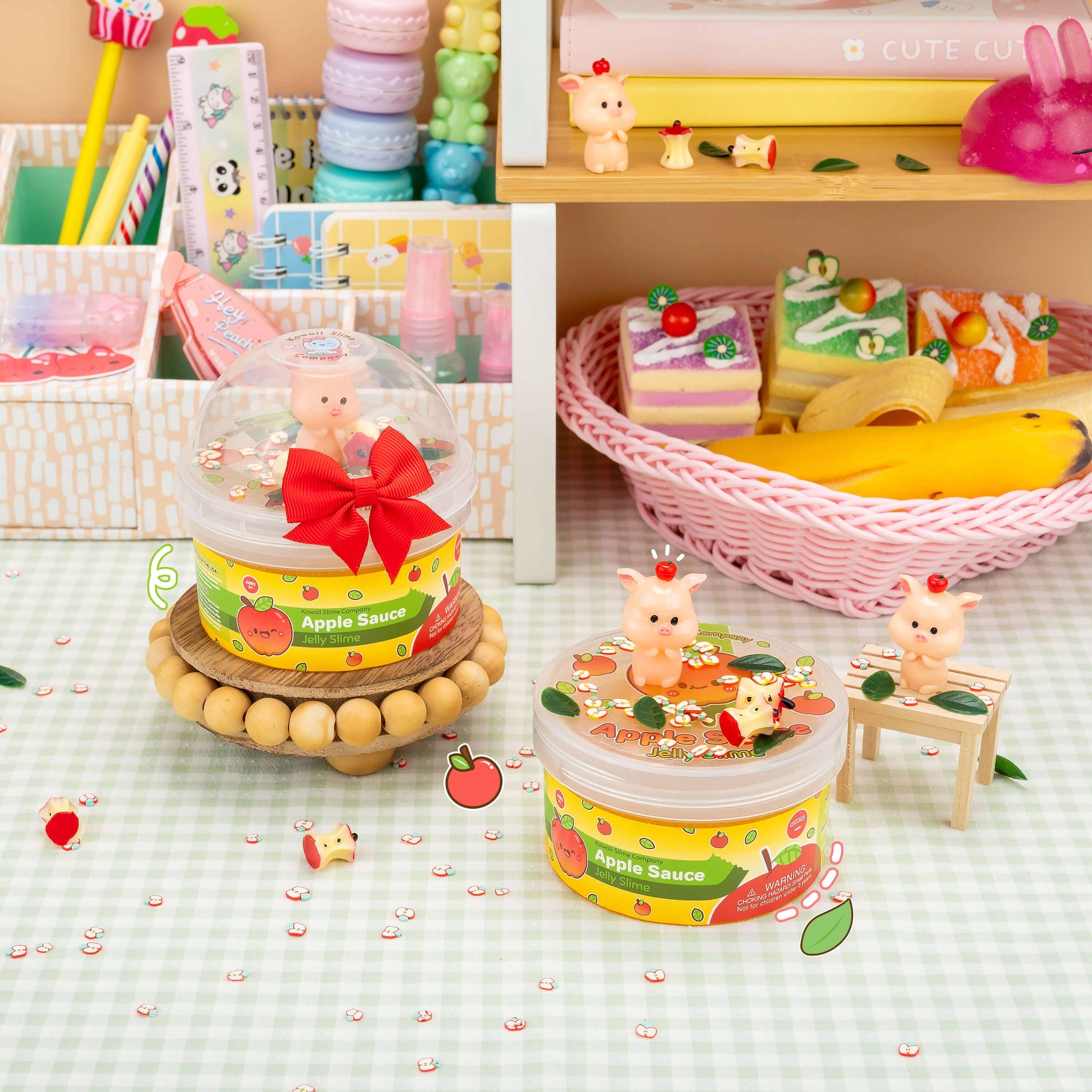 Indulge in a playful blast from the past with our Apple Sauce Jelly Slime! The jelly slime texture will remind you of playing with your food as a kid, while the deliciously nostalgic apple scent will have you craving more. Adorned with apple core charms, apple slice fimos, and a cute apple balancing piggy charm, this slime is everything apples!