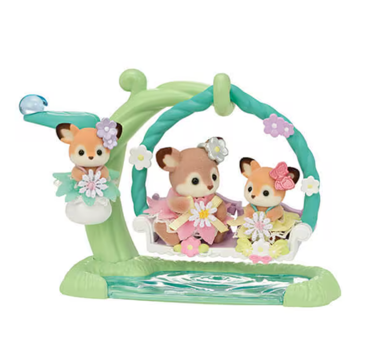 The Deer family have adorable big ears. This set contains the Deer baby and cradled babies in matching floral outfits with an ivy swing and lily of the valley cradle. The babies can sit in the swing by the water or in the lily of the valley cradle. The figures have different colours and ear patterns! The cradled babies are caramel-coloured, while the baby is cocoa-coloured with petal-patterned ears. There are flower and butterfly ear decorations for the babies to wear. The babies can also sit on the leaf, which has a clear drop of water on it.