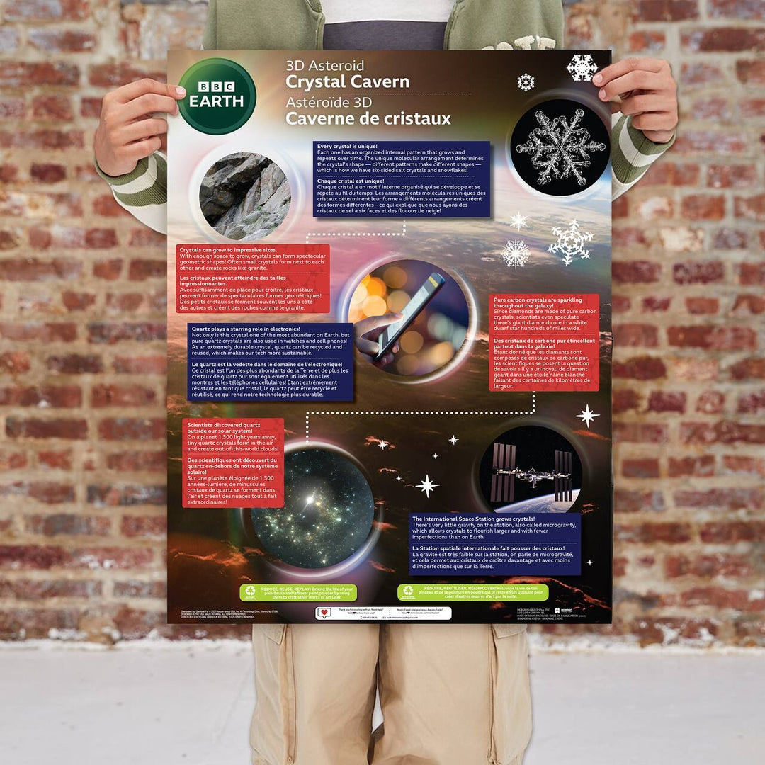Explore the depths of crystal chemistry as you grow your own inside a cavern! Developed alongside scientists and researchers, the BBC Earth 3D Asteroid Crystal Cavern gives you an up-close look at the crystallization process in action β simply fill the cavern with a crystal-growing solution and watch crystals grow! In just 4-6 hours, your dazzling crystals will emerge, forming interesting colors, patterns, and shapes β just like they do in the real world. The double-sided instruction guide unfolds into a cool educational poster, so you can learn about the fascinating world of crystal formation while you observe it right from home! This engaging kit makes learning fun, providing a hands-on approach to the exploring STEM! Perfect for anyone ages 6 and older.