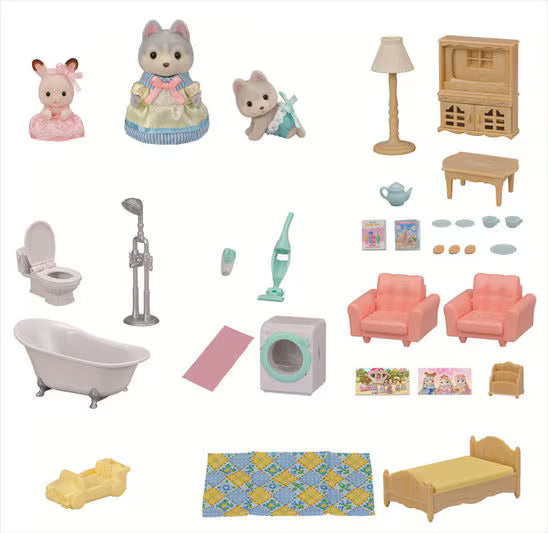 Husky Girl, Husky Baby (crawling), Chocolate Rabbit Baby (sitting), Main unit A, Main unit B, Front porch, Chimney room, Roof unit, Open/Close wall, Ladder, Bay window roof, 2 lampshade A's, Lampshade B, Stairs, Shaft, 2 floors, Mailbox, Letter, Ball abacus, Baby table, 3 window frame A's, 2 window frame B's, 2 fence A's, Fence B, 5 fence C's, Ride on vehicle, Washing Machine, Vacuum Cleaner,Towel, Bed,Duvet, TV with stand, 2 Armchairs, Table, Teapot, 2 Saucers, 2 Teacups, Serving plate, 3 Leaf cookies, Magazine rack, Magazine A, Magazine B, TV āchannelā A, TV āchannelā B, Floor lamp, Toilet, Bath tub, Shower stand