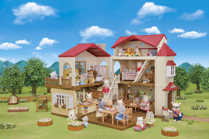This set contains the Red Roof Country Home, furniture in original colours, and the Husky Girl, Husky Baby (crawling) and Chocolate Rabbit Baby (sitting), all in special outfits. The attic has a slide-out ladder! It is a big house that can be opened up for play and has lamps that light up. You can change the layout of the house by removing the rooms and roof. With the attic on top (a secret playroom for the babies!) the house is three storeys high. With so many types of furniture and figures, the fun never ends! Comes with a letterbox and a letter to put in it! Combine with other furniture and figures (sold separately) to act out even more stories.
