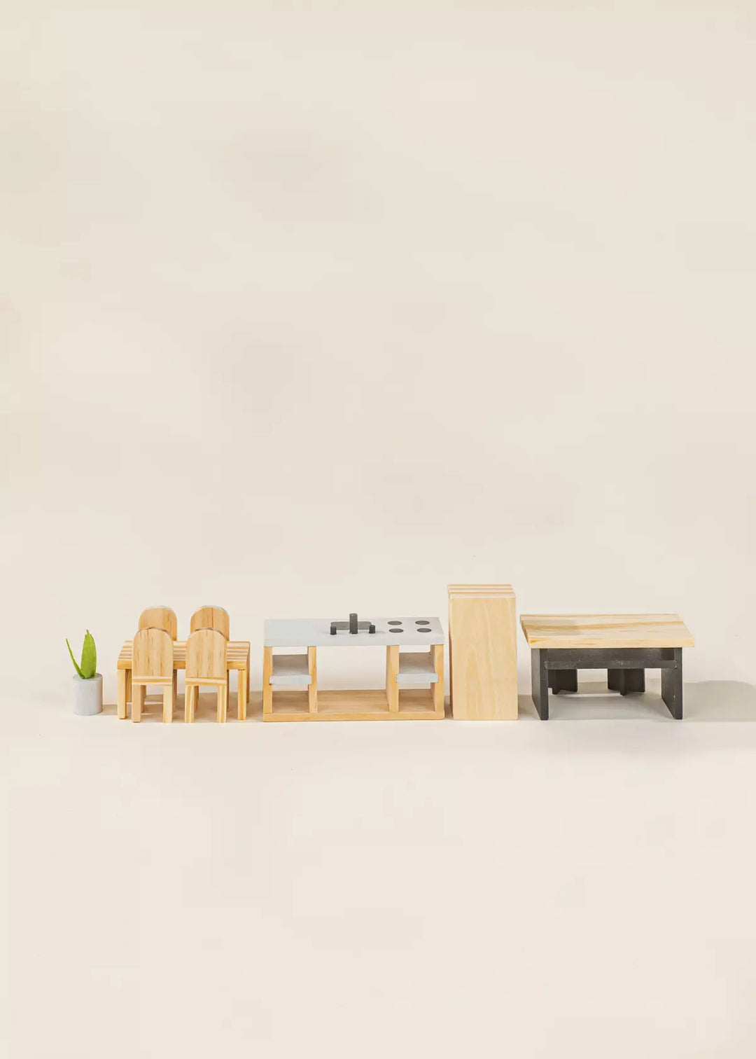 This Doll House set of furniture and accessories is all about creating a welcoming and warm space. Each item allows the child to arrange the space by giving free rein to their imagination.