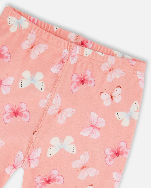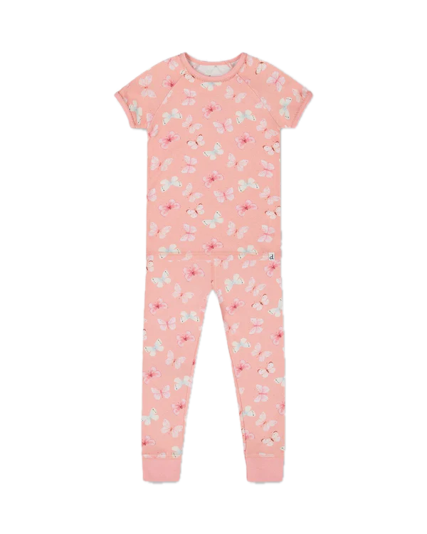 Sleeping or lounging, she'll be oh-so-adorable in our Organic Cotton Short Sleeve Top and Pant Pajama Set Pink and Blue Butterflies on Old Pink. This ultra-soft set features a raglan sleeve top with a round neckline, picot trim, and an allover butterfly print. We've teamed it with a matching pull-on pant with a stretch elastic waistband for ultimate comfort.