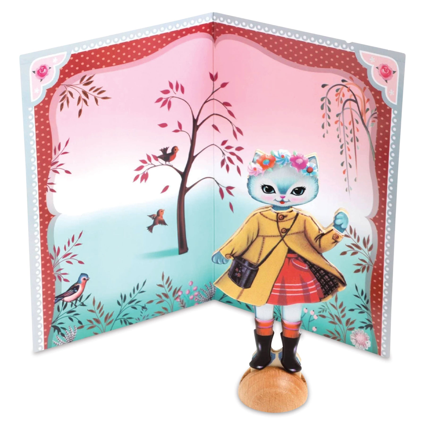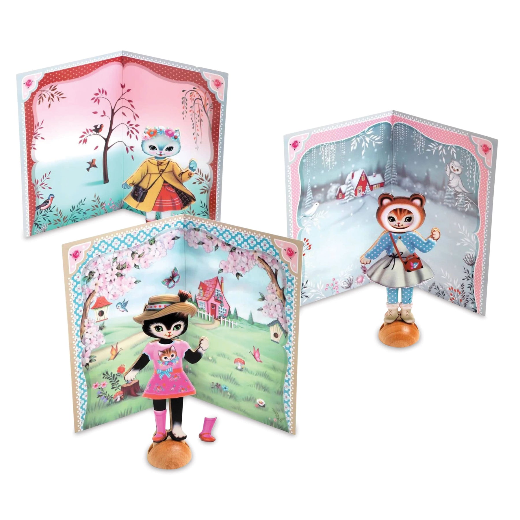 Contents: 3 wooden cats with stand, + 45 sturdy reusable items of clothing (3 sheets), 3 cardboard scenes and 1 step-by-step instruction booklet.