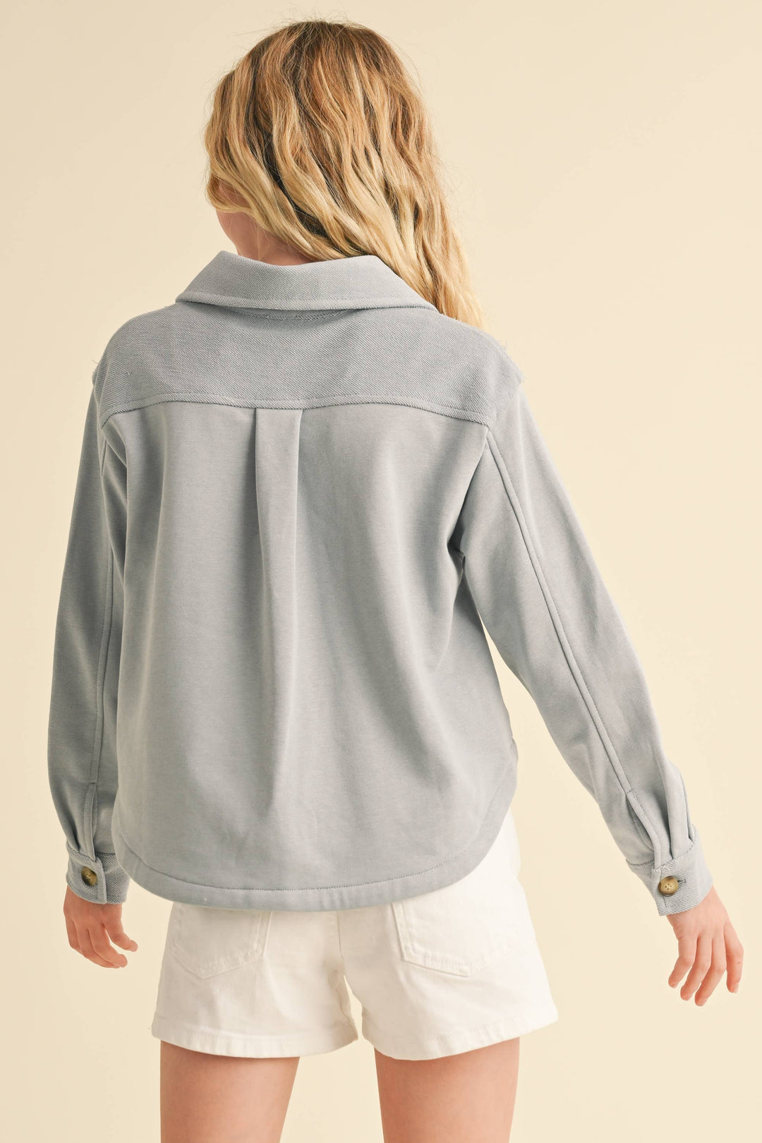 This cozy, cropped shacket is the perfect blend of style and comfort for your little one. Featuring double front pockets, it’s both functional and trendy, providing a relaxed yet fashionable fit. The soft, warm fabric makes it ideal for layering over any outfit, while the cropped design adds a modern twist to the classic shacket style. Whether she's heading to school or out with friends, this shacket will keep her cozy and cute all day long.