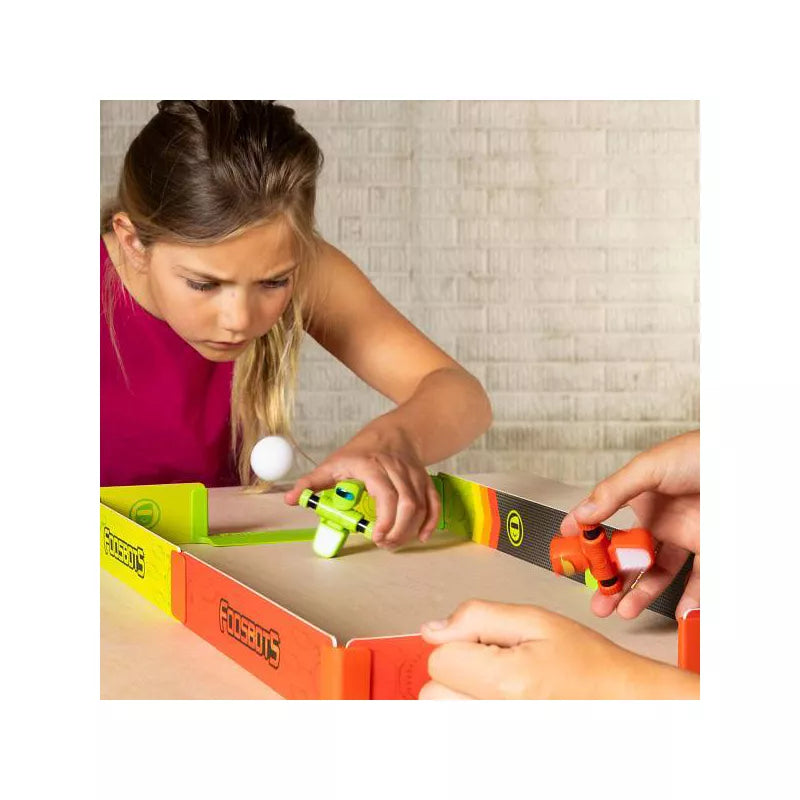 Spin, kick, and WIN with the Foosbots Stadium Battle set by Fat Brain Toys! Fit the parts together to build the stadium, then grab the two included Foosbots. When you squeeze your Foosbot’s arms, it spins to kick the ball FAST. Can you get the ball past your opponent and score the winning goal? Complete with training gear for honing your skills on the sidelines, the Foosbots Stadium Battle set by Fat Brain Toys is a must-have for the ultimate tabletop tournament!Encourages hand-eye coordination, fast reflexes, imaginative play -