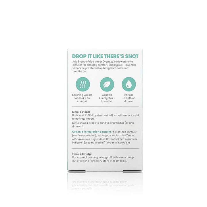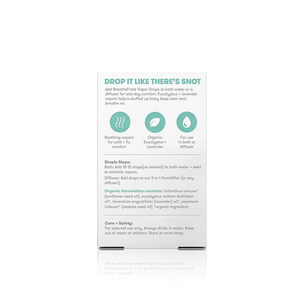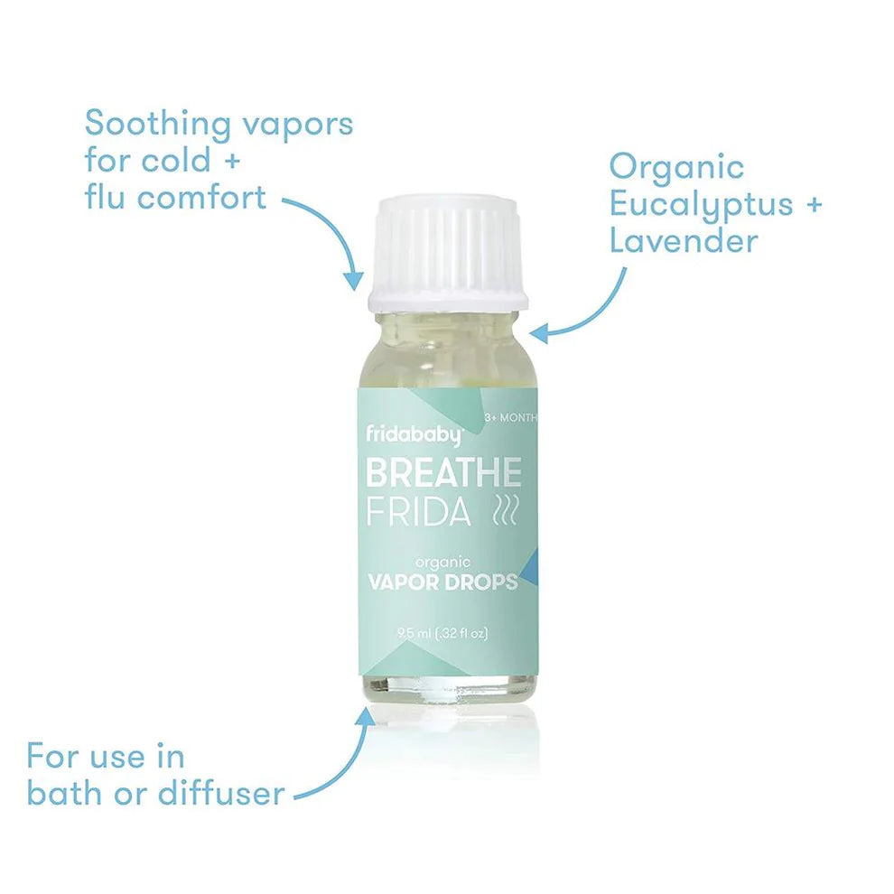 Fridababy's BreatheFrida Vapor Bath Drops deliver cold and flu season comfort with organic eucalyptus and lavender oils that help baby keep calm and breath easily. Simply drop in to warm bath water or place a few drops into a diffuser.
