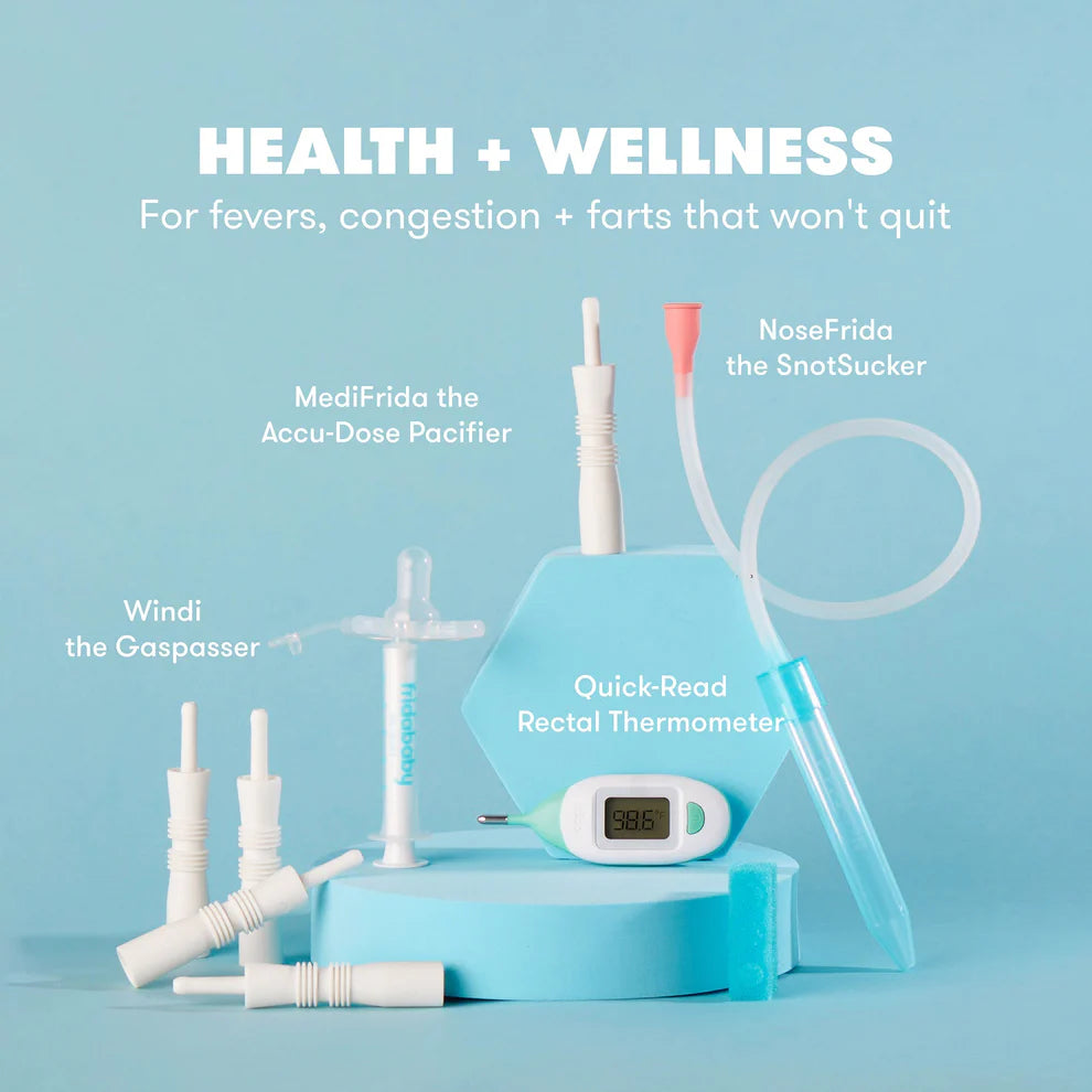 - SICK-DAY ESSENTIALS: Three essentials to provide relief to a sick or congested baby: NoseFrida the SnotSucker clears away mucus, the MediFrida Accu-Dose Paci delivers the right dose without spitup, and the Quick-Read Rectal Thermometer gets a temp in 10 seconds