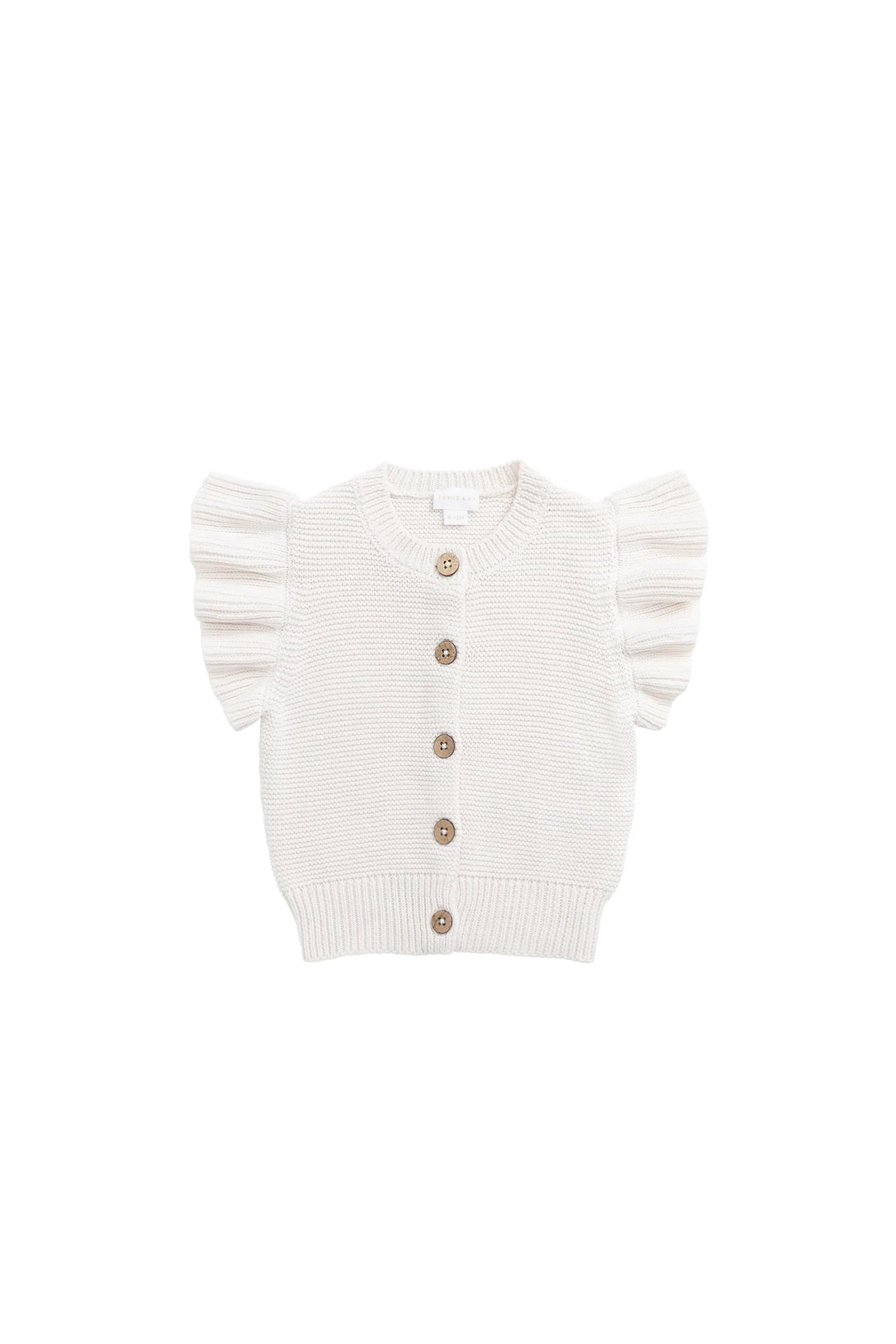 The Elise Vest – Parisian Pink is a beautifully knitted cardigan-style vest in a soft pink hue. Featuring short ruffled sleeves, a round neckline, and five coconut buttons down the front, this piece adds a touch of charm and warmth to any outfit. Perfect for layering over dresses or tops, it’s a versatile addition to your little one’s wardrobe.