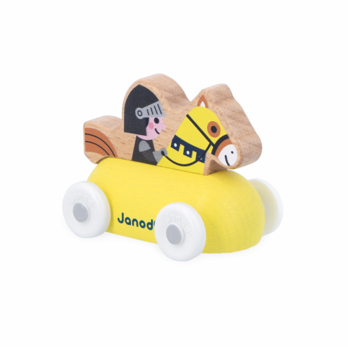 Gallop on: to the great knights' tournament!" This little wooden vehicle is suitable for children aged 12 months and over. With its rolling horse, the valiant knight is off to training and to attacking monsters! The shape has been specially designed for little hands, who can easily hold it by the top to make it roll. The vehicles are perfect for inventing stories and developing imagination! Babies first have fun rolling them around, then older children tell all kinds of adventures, developing their vocabulary and creativity. This little Janod car is part of our Cross Roads collection: a series of playmats with circuits, made even more fun when complemented by our cube sets and small wooden vehicles. The knight's carriage is particularly suited to the Enchanted Kingdom playmat, but goes just as well with other playmats in the range. It's made from wood from sustainably managed forests. "Quick, let's catch that wild unicorn!"