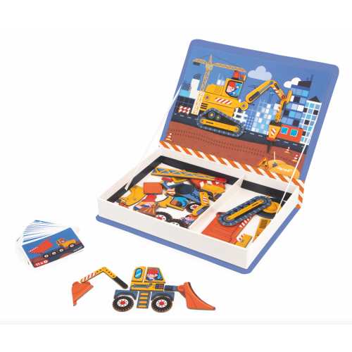The city is growing: it's time for new buildings, and the workers on the site don't mind a little help! This magnetic educational game is sure to delight gear fans aged 3 and over. Stimulating the imagination is a key stage in a child's growth: with the help of this Magneti'book, your little one will be inclined to imagine countless stories and vehicles. They can either refer to the models and colorful illustrations, or imagine their own stories from A to Z by mixing magnets. This magnetic set includes 50 magnetic pieces and 18 models with urban designs. Your child can reproduce the famous construction crane, but also a bulldozer, a jackhammer or a shovel! The multitude of magnets allows you to immerse yourself in an infinite number of cross-fertilization possibilities. All these machines have never been so close at hand! Handling magnets stimulates your children's fine motor skills. They're easy for little ones to grasp. This book-sized magnetic toy is ideal for taking everywhere. There's no limit to their imagination once they've left the house. This fantastic magnetic toy is the latest addition to the Janod Magneti'book collection, featuring animals, trades and firefighters. This magnetic educational game is made from certified cardboard and controlled materials.