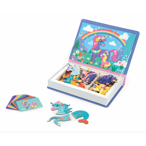 Majestic and fantastical unicorns are simply magical! This magnetic educational game will immerse children aged 3 years and up in fairyland. Imagination stimulation is a key stage in a child's development: with the help of this Magnéti'book, your little one will be prompted to invent countless stories. They can either refer to the models and colourful illustrations, or invent their own stories from scratch, by mixing the magnets as they see fit. This magnetic game consists of 44 magnetic pieces and 10 fantastically-illustrated models. Each unicorn has their own setting. The various decorations and many magnets allow for countless hybrid options. A winged or finned unicorn, in a meadow or the sky... everything goes! Many enchanted worlds are within easy reach of your children. Your children's fine motor skills will be stimulated by handling the magnets. In fact, they are easy for little ones to grasp. This book-sized magnetic toy is ideal for taking anywhere. In fact, the only limit is their imaginations once they cross the threshold. This fantasy-based magnetic game belongs to a large family of Janod Magnéti'book products: there are animals, occupations, firefighters and more.