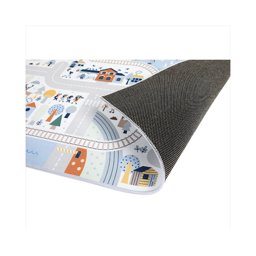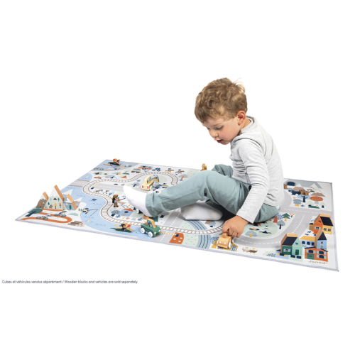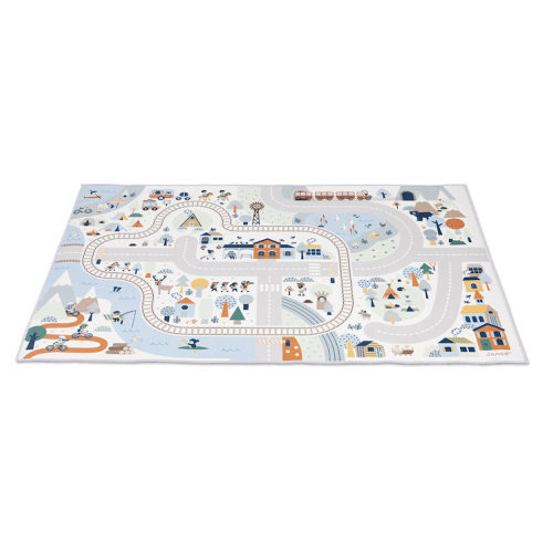 Direction: the Mountain Valley! In this snowy, winding setting, you can travel without fear of cold or altitude! This Mountain Valley playmat is suitable for children aged 2 and over. It features a long, wide road, as well as a railroad track, for venturing into the heart of winter and imagining endless stories! On their play mat with circuit, little ones enjoy winding mountain roads in search of hidden elements, like a search and find game. Spot where the little cat is, the bear out of its den, and stop at the level crossing when the train approaches... There are so many natural elements, animals and characters represented! We start by climbing the mountain passes on our bikes, then head off on a hike to discover the mountain animals, before heading to the equestrian center for a horseback ride. With their fabric play mat, children develop their imagination and vocabulary, as well as their sense of observation. Little ones can even discover shapes and numbers! Another plus for this children's play mat: it's non-slip! Perfect for rolling toy cars on, or simply for little ones who like to keep on the move. In its 47 x 30 In format, this mat for children's bedrooms offers other play possibilities with its accessories (sold separately): it can be completed with a range of vehicles and wooden blocks, also from our Cross Roads range. You can also link this mountain mat with other mats in the collection, to create a giant play area and extend children's adventures. In fact, the circuits are designed to link up on all 4 sides of the mat. Let's take the night train!