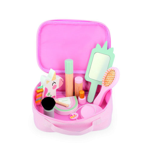 Looking like a unicorn? With this beauty case and its 10 accessories, children can imitate the grown-ups and pamper themselves with their own essentials, from the age of 3. As well as imagining a host of stories in the fabulous world of unicorns, little ones learn how to take care of themselves, their loved ones and their toys! For a fairytale beauty makeover: 1 eye shadow palette with brush and 1 mascara, for illuminated eyes - 1 lipstick, for a sublimated mouth - 1 nail varnish, for hands to die for - 1 hairbrush and 1 elastic, to style their pretty manes - 1 brush and 1 blush, for cheeks as pink as candy - 1 mirror to admire themselves, and 1 perfume for the finishing touch. The unicorn sticks out her tongue when you press down on her mane - what a little mischief! All accessories can be stowed away in the attractive zipped case, making them easy to carry and always available to pamper others, or yourself. The wooden make-up accessories are toys, not cosmetics. They are made of wood from sustainably managed forests. At Janod, unicorns are clever and use magic to keep their secrets. Impetuous and iconic, they evolve in a poetic universe of timeless colors. So let the magic of unicorns take over your style!