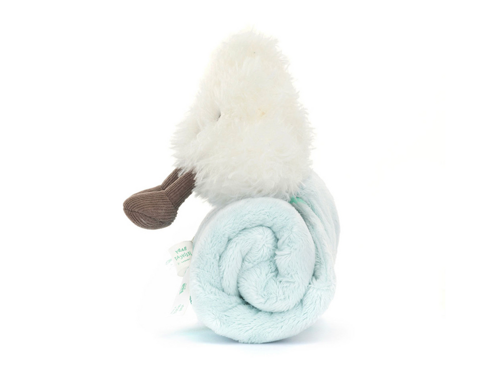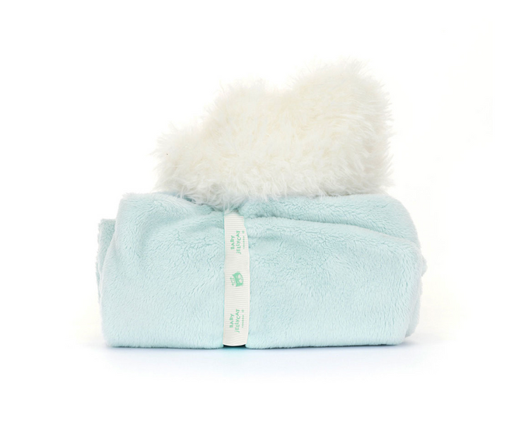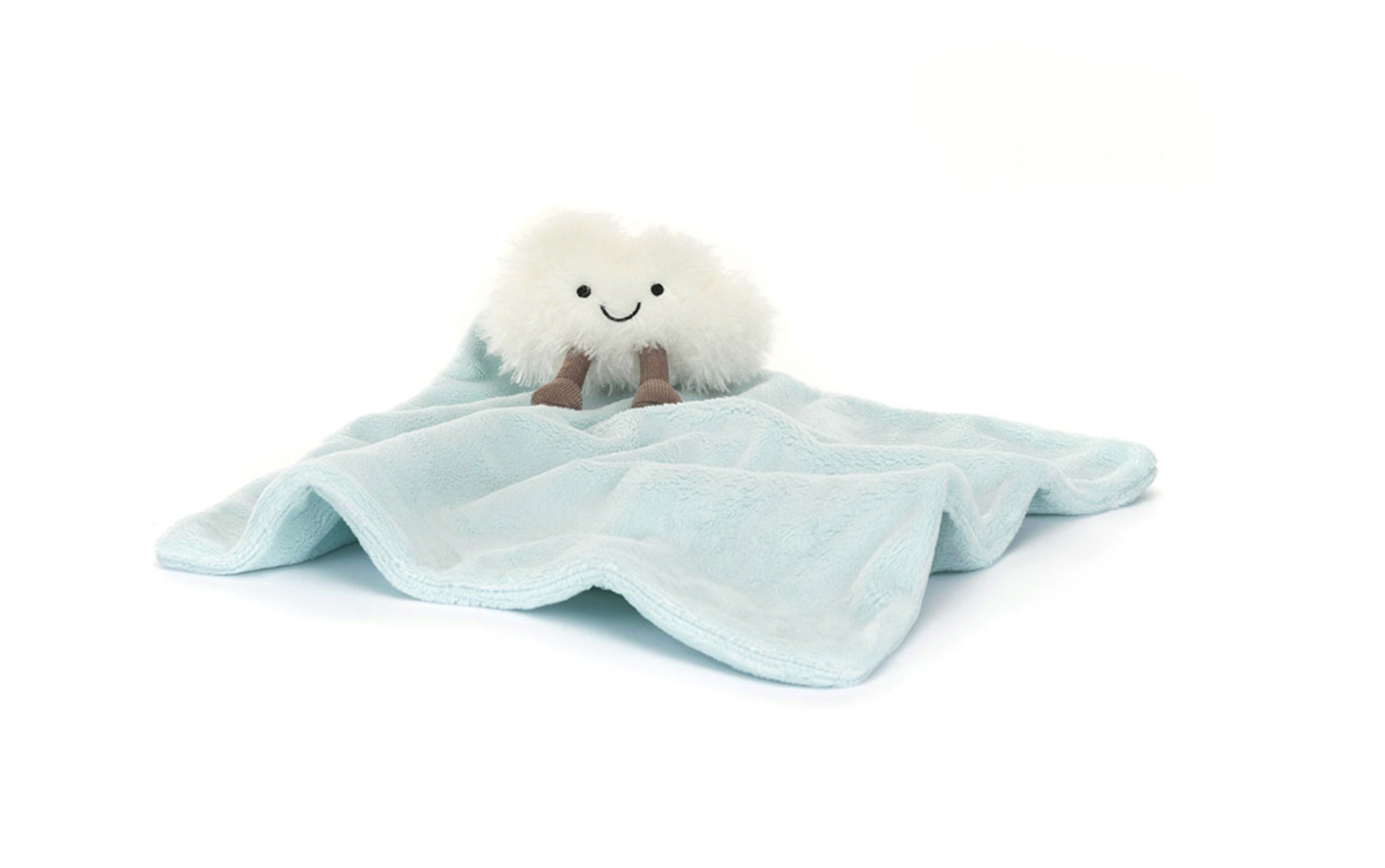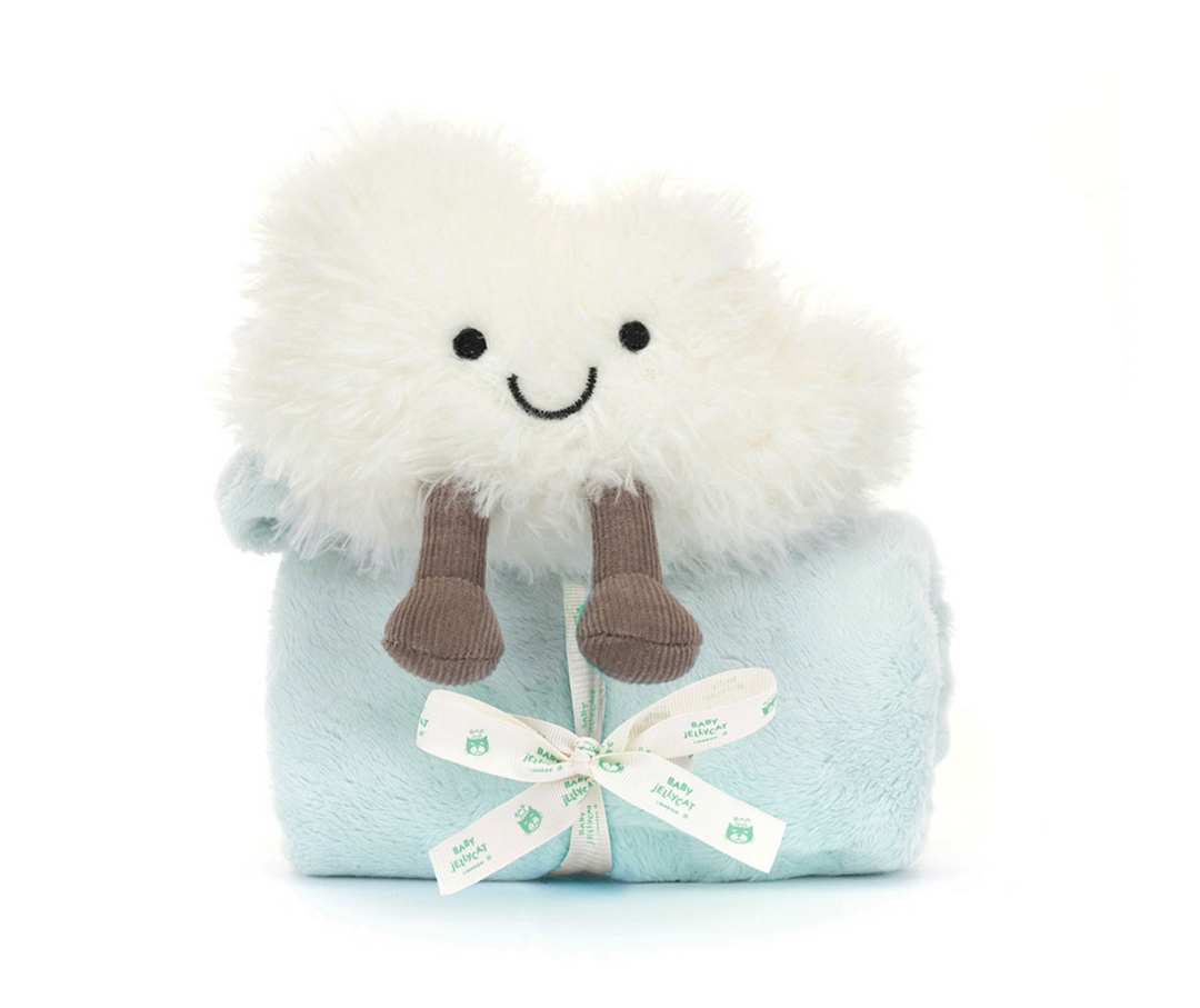 The Amuseables Cloud Soother brings smiles whatever the weather, rolled up and presented in a Baby Jellycat grosgrain ribbon. Both cream cloud and blue soother are made with the softest recycled fibers. With cheery embroidered eyes and smile to brighten every day, it makes for a perfect newborn gift.